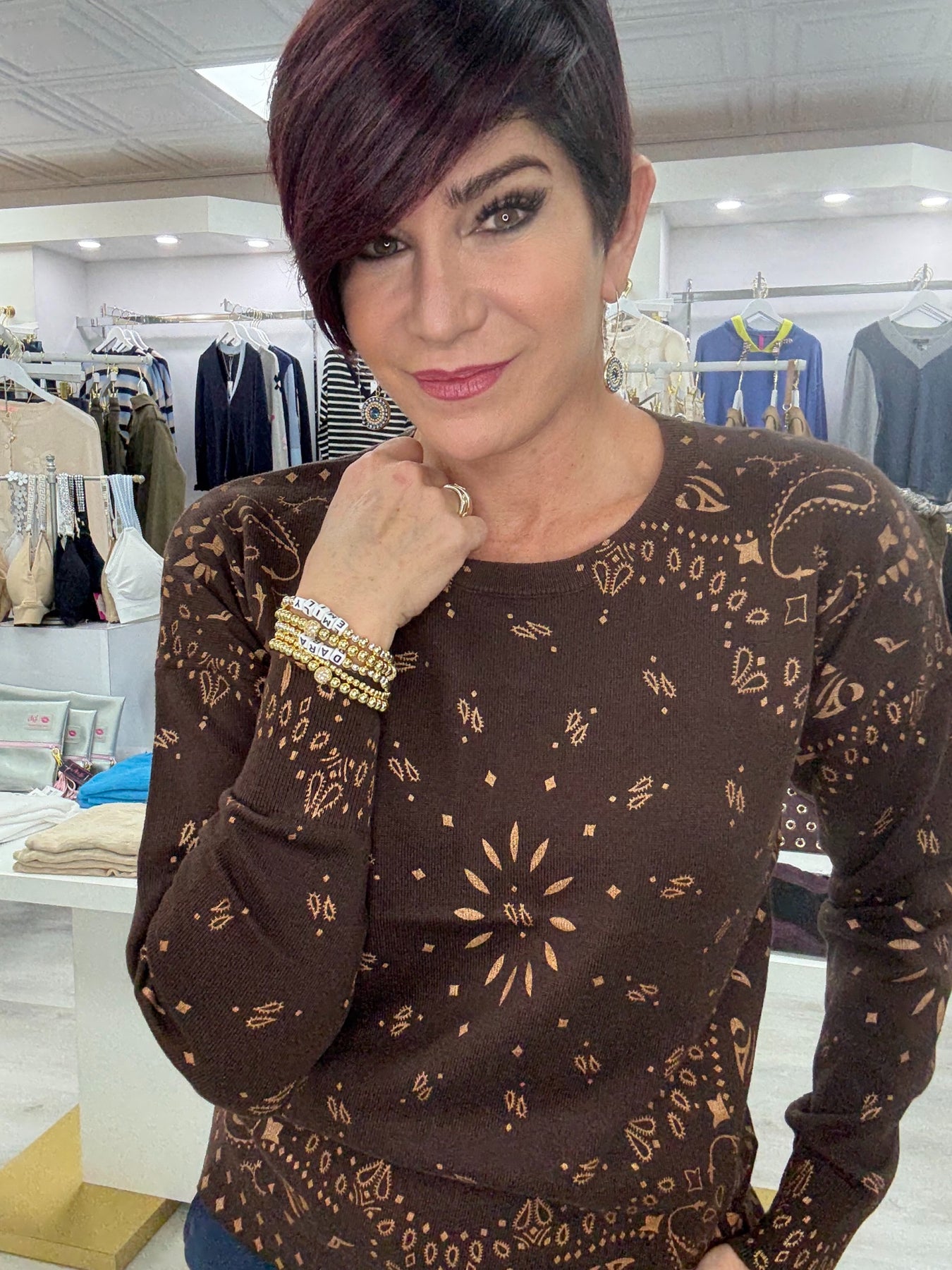 Indulge in luxurious comfort with our Chocolate Foil Bandana Sweater. This casual sweatshirt features long sleeves, a crew neck, and a fine ribbed hem for a stylish yet relaxed look.