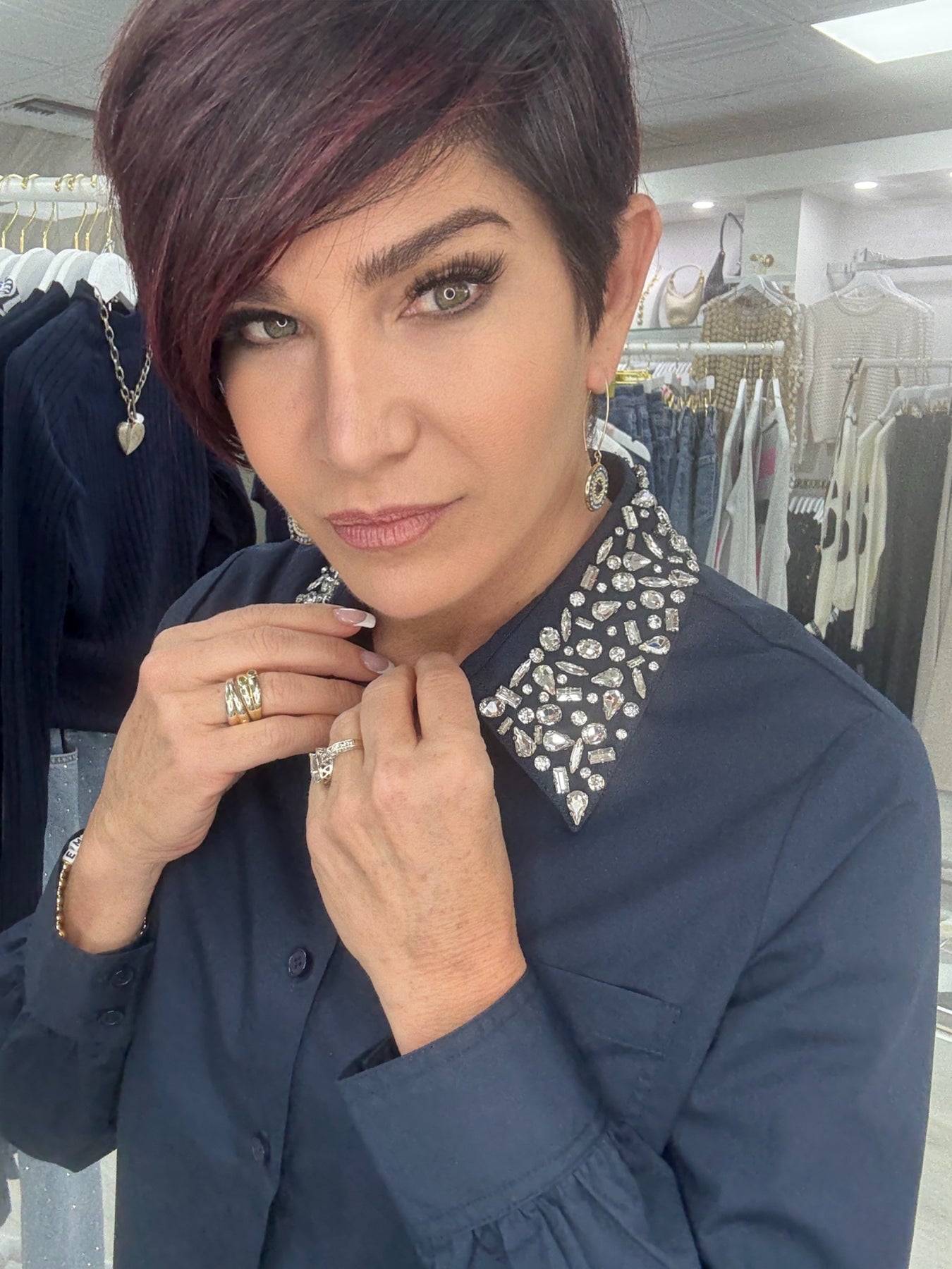 The crystal-adorned neckline adds an unexpected touch of glamour, making it effortlessly versatile—dress it up for evening occasions or style it casually with your favorite denim.