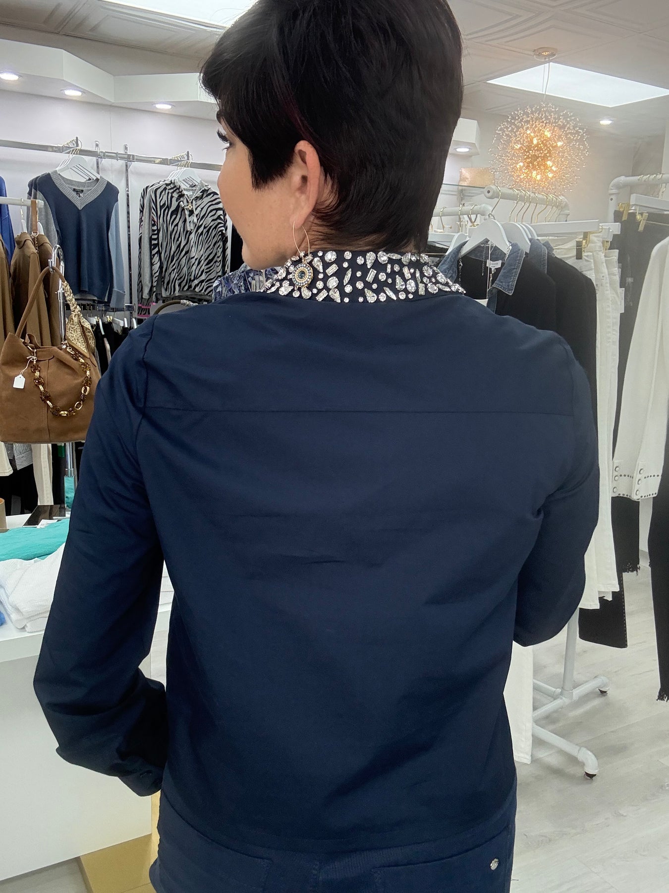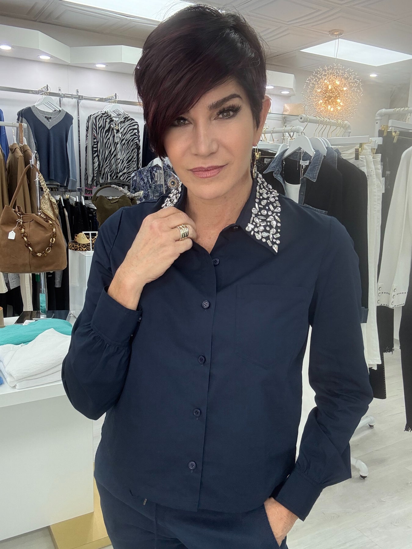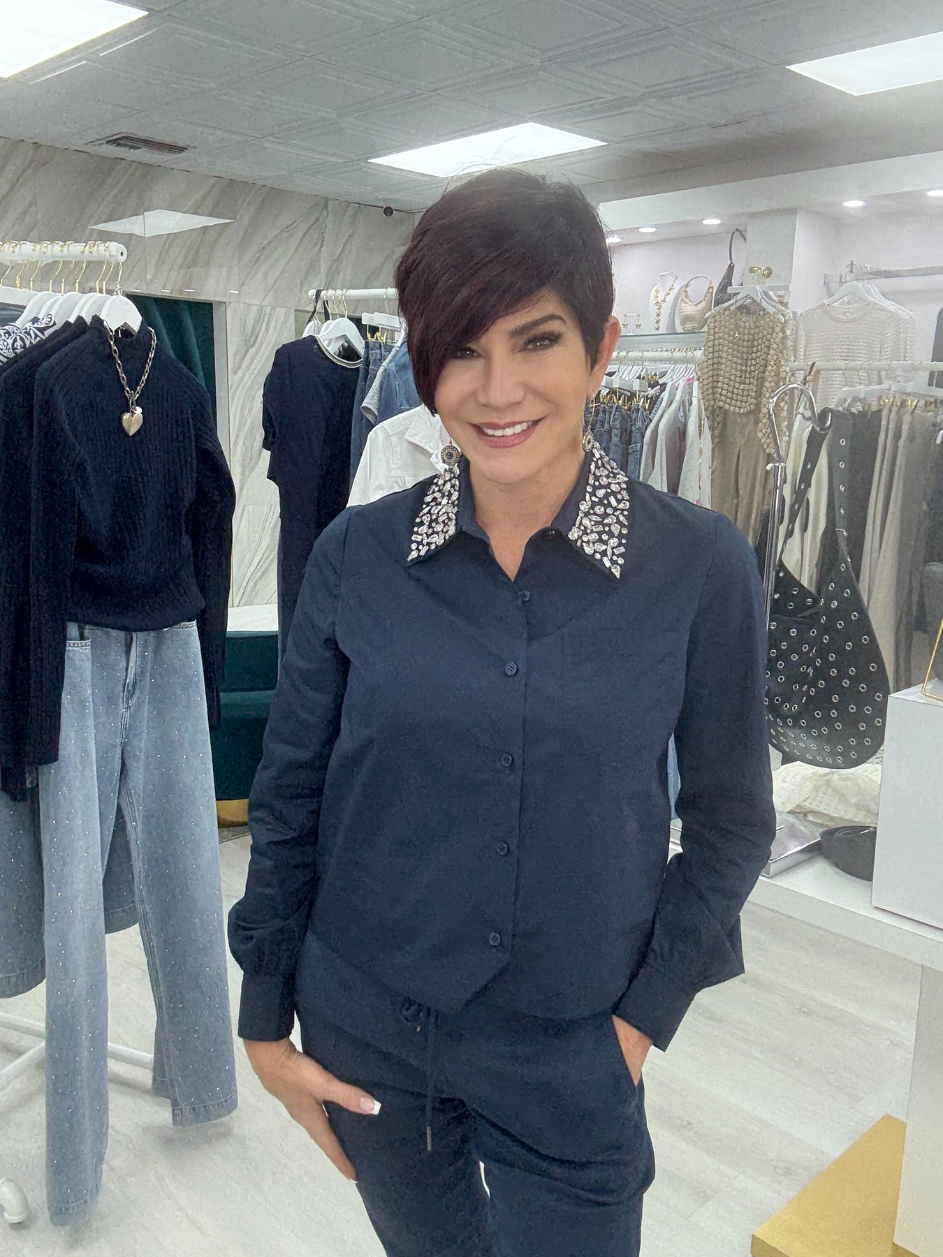 Elevate your wardrobe with this sophisticated long sleeve crop top, featuring an exquisitely embellished collar that commands attention.
