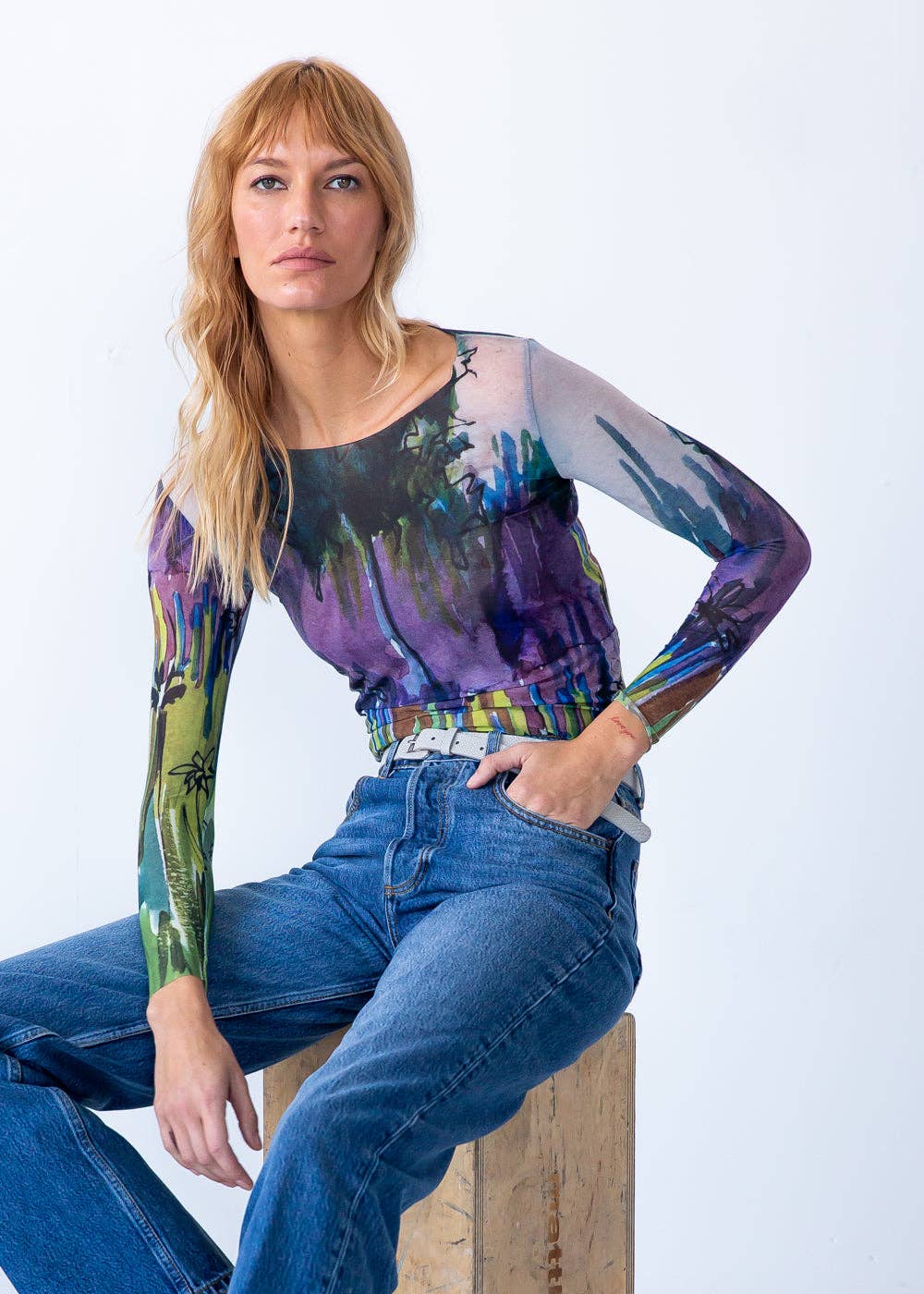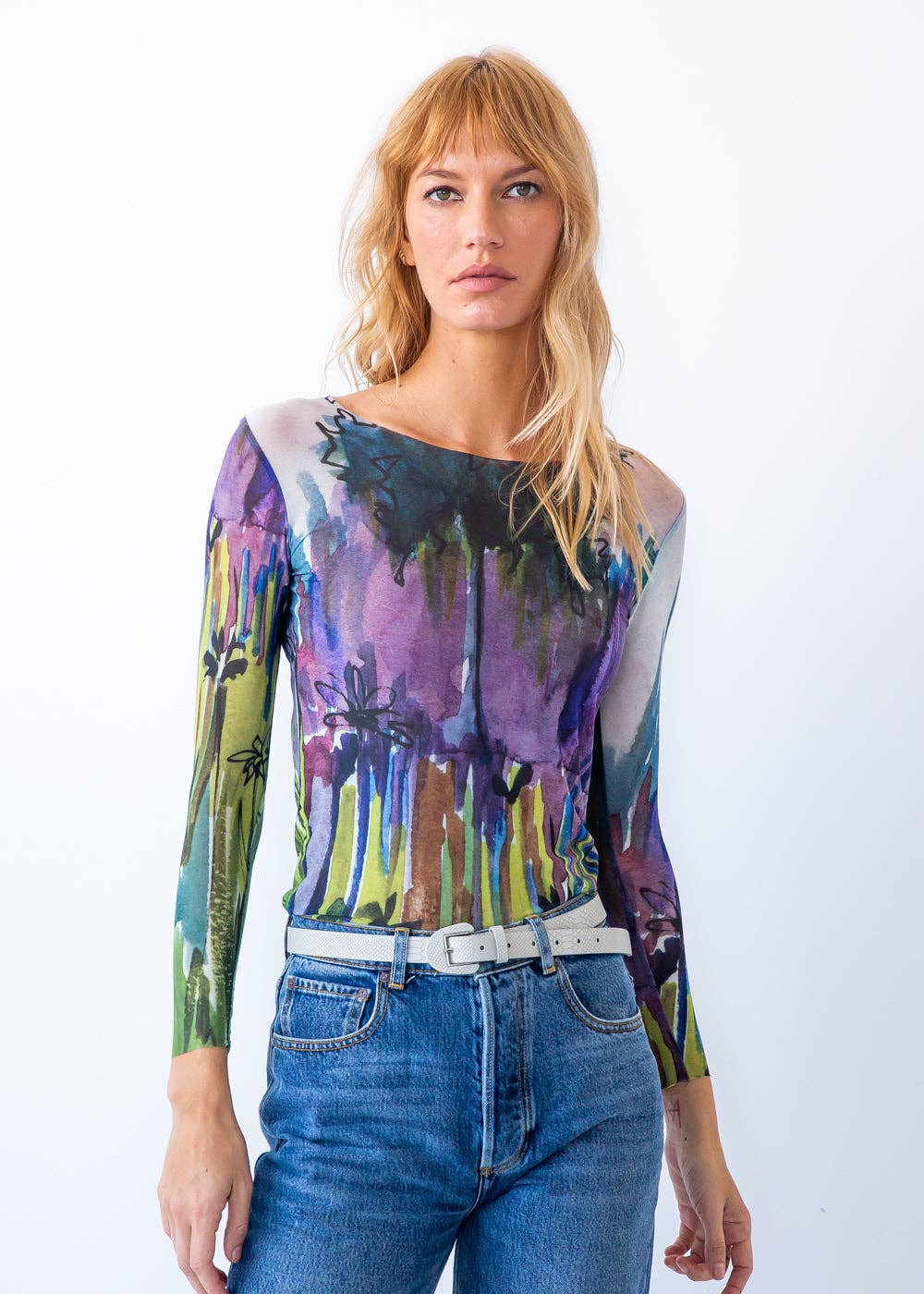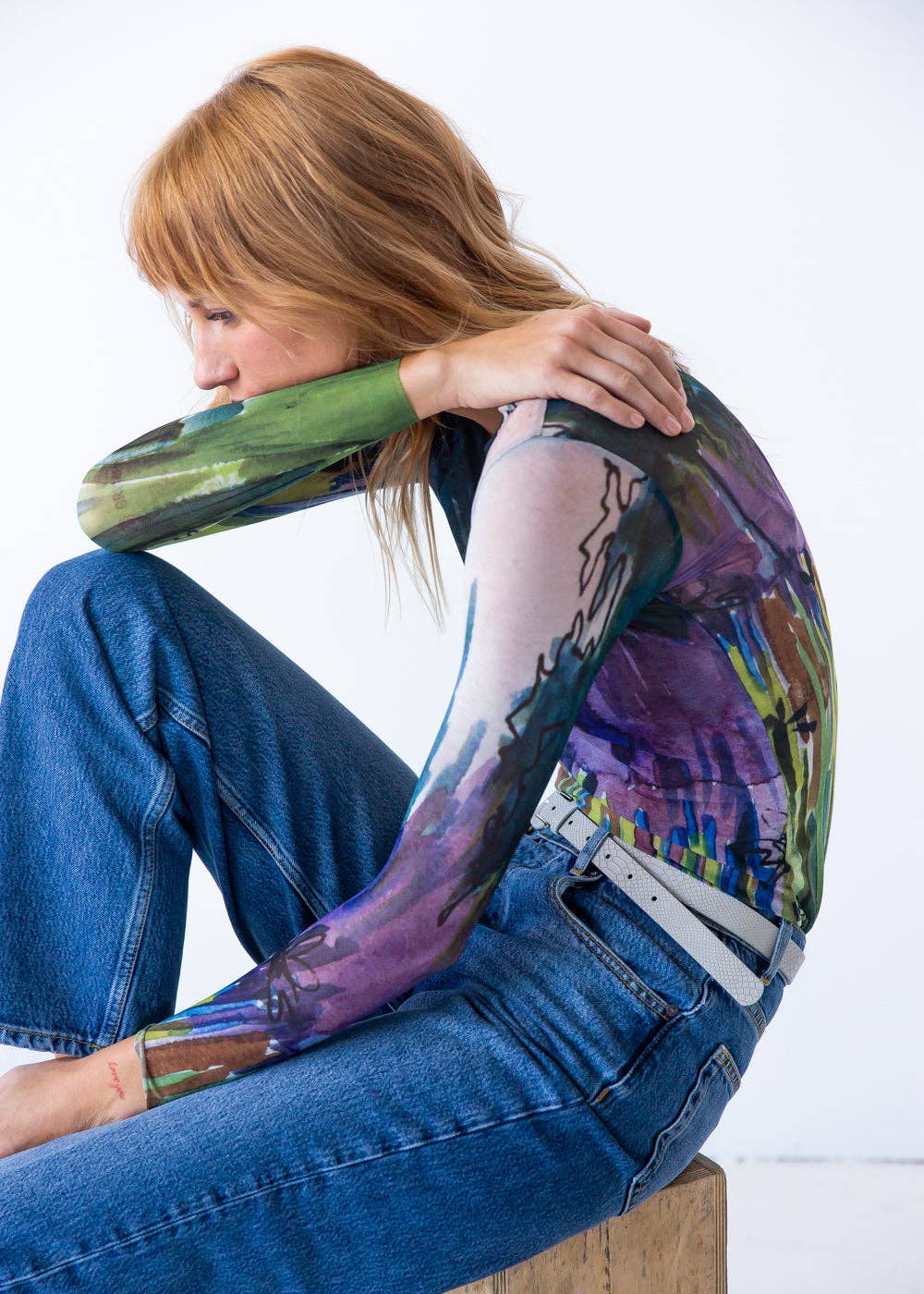 From our premium LaPiel collection, proudly made in USA. Silky soft mesh fabric, single layered for the perfect second skin feel. Hand painted Daydream print in purple, blue and green One Size fits 0-14 90% Nylon 10% Spandex Made in USA