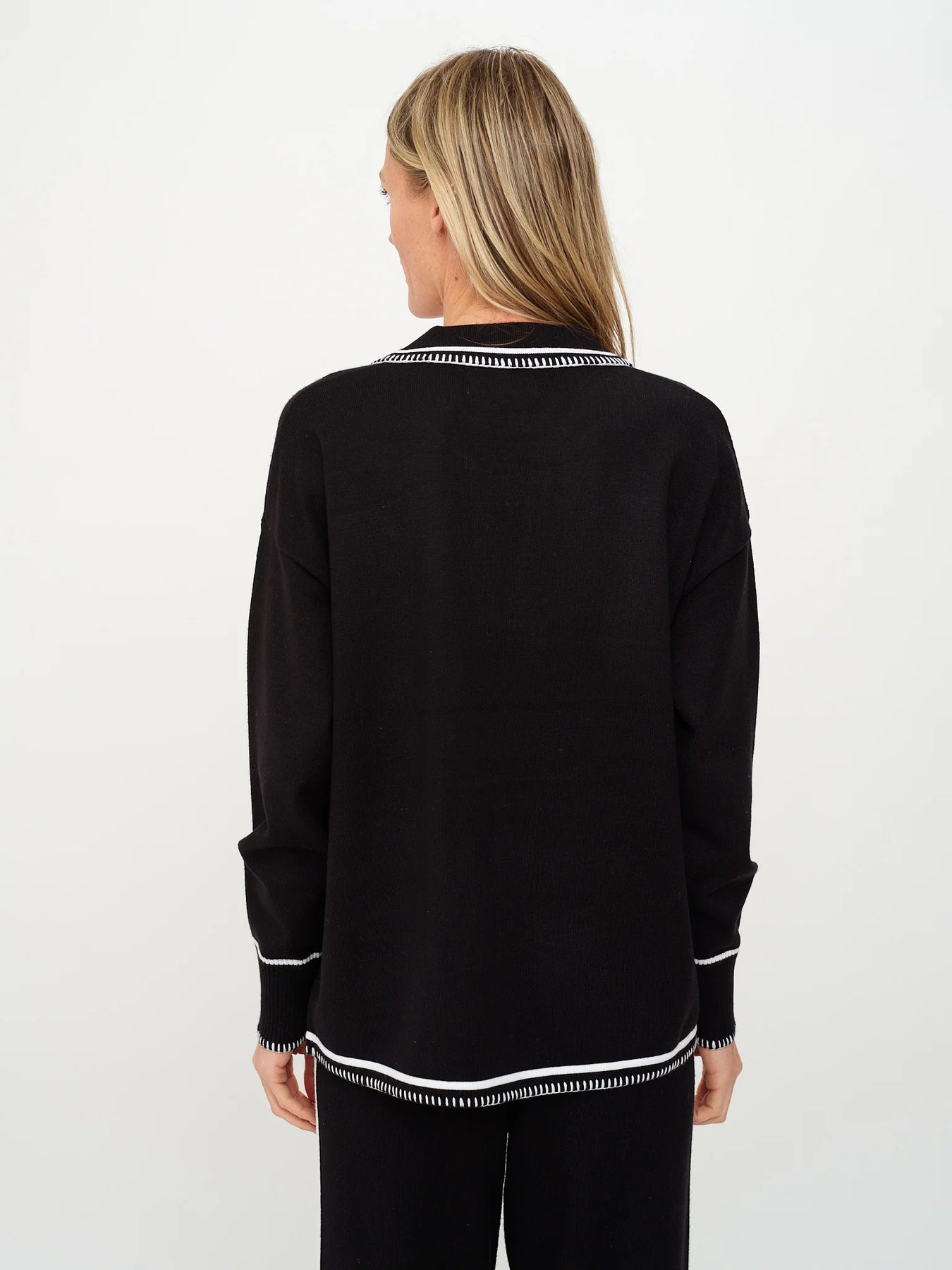 The kellie top brings a fun twist to your wardrobe with its cozy feel. Featuring a stitched v-neck with a chic collar, this top stands out with its sleek black base accented by crisp white trimming. Perfect for adding a playful yet polished touch to any outfit! Pair it back to the kellie pant for an instantly chic outfit.