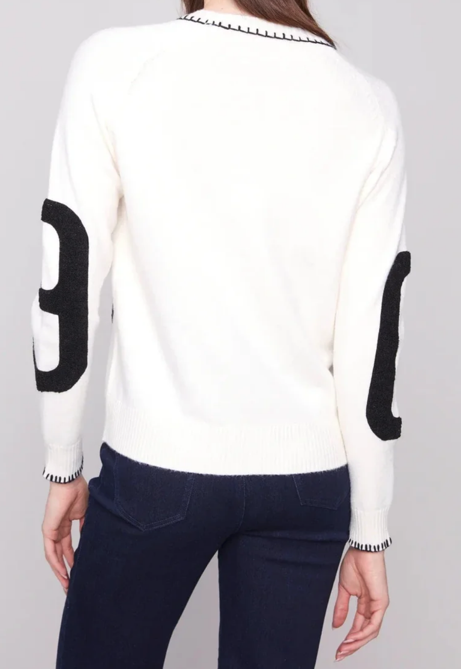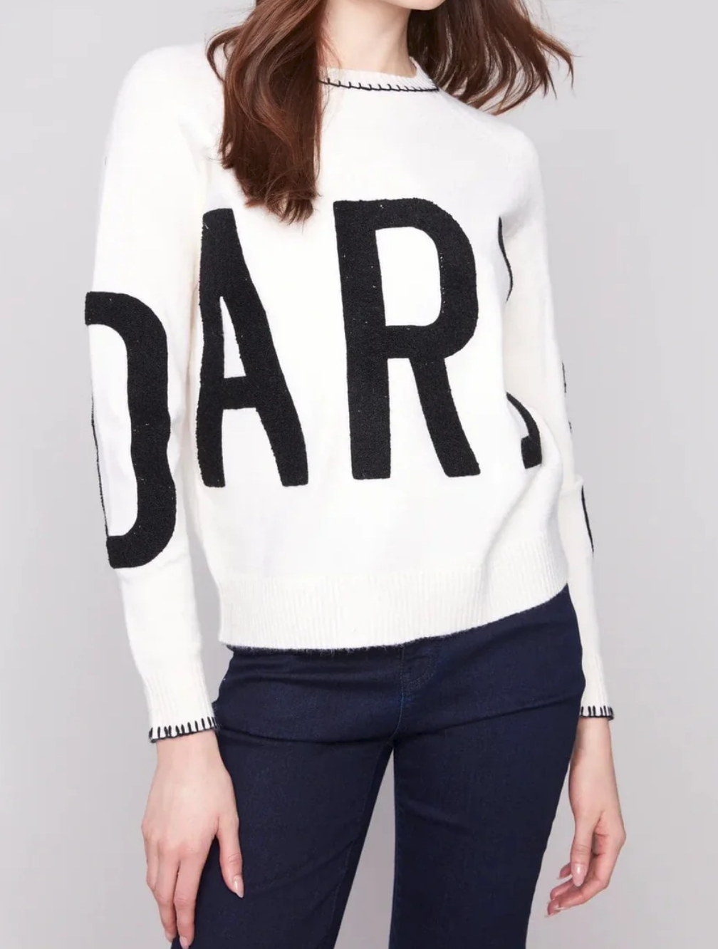 Elevate your collection with the Charlie B Paris Boucle Sweater in refined ecru. Its soft boucle fabric provides gentle warmth and a luxurious feel, while the distinctive blanket stitch detailing adds an artisanal elegance. Ideal for layering or as a standalone piece, this sweater enhances any ensemble with timeless sophistication and comfort. Embrace understated style with this effortlessly chic wardrobe essential.