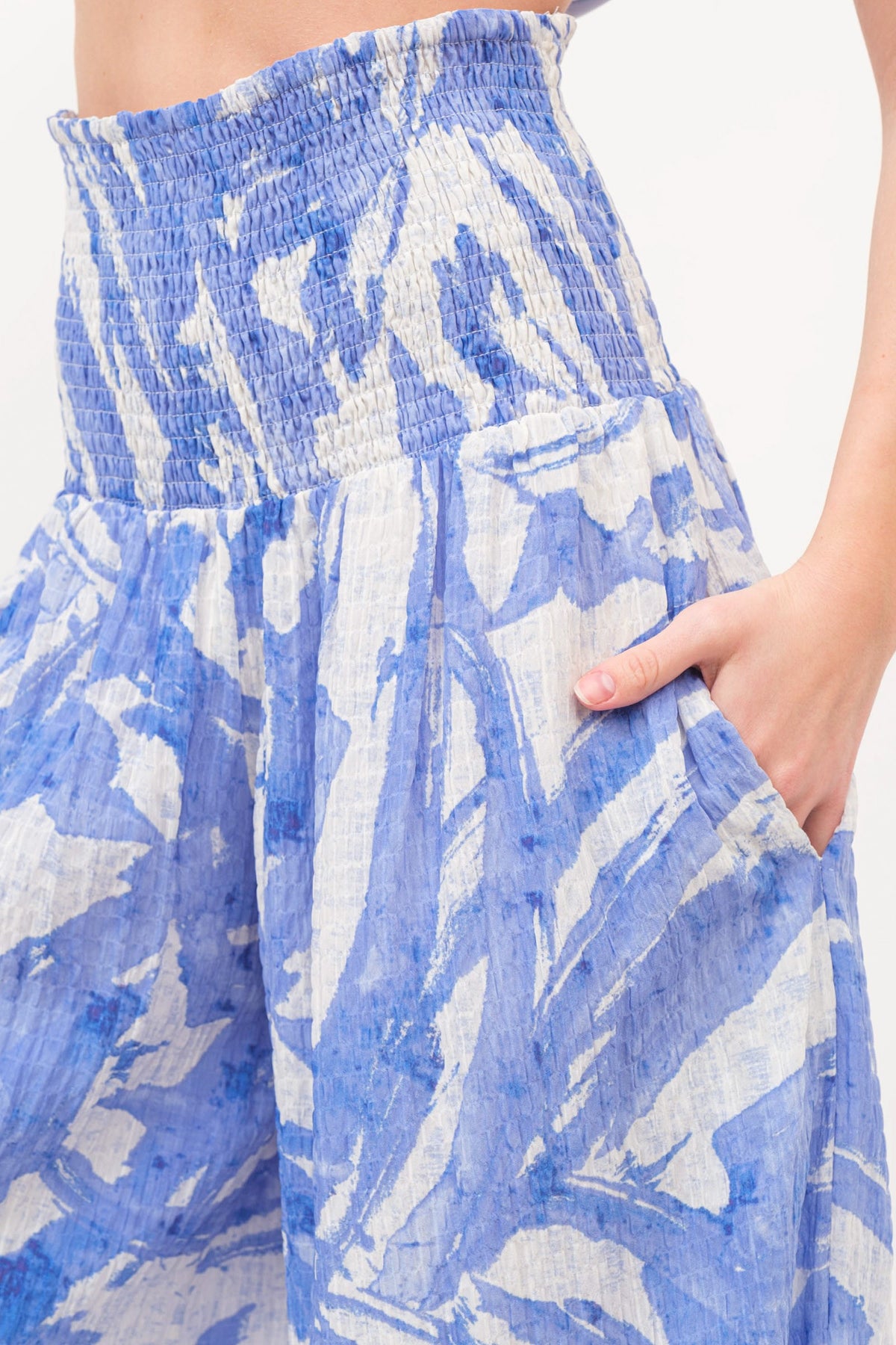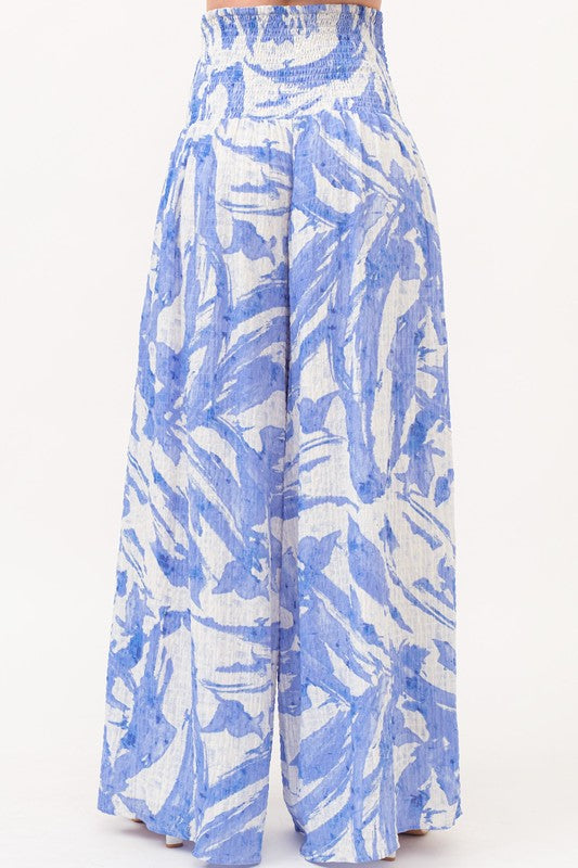 Elevate your wardrobe with our luxurious Abstract Print Wide Leg Pant. This exclusive design features abstract prints, a flattering tie waist, and a comfortable smocked elastic waist. Fully Lined. Fabric on body and lining is 100% Polyester. The perfect combination of style and comfort, these pants will make a statement in any setting. Inseam 30" Matching top sold separately.