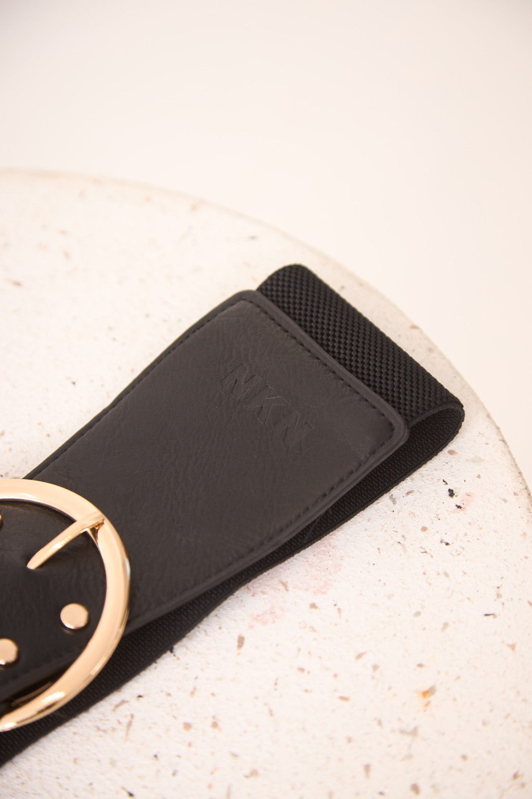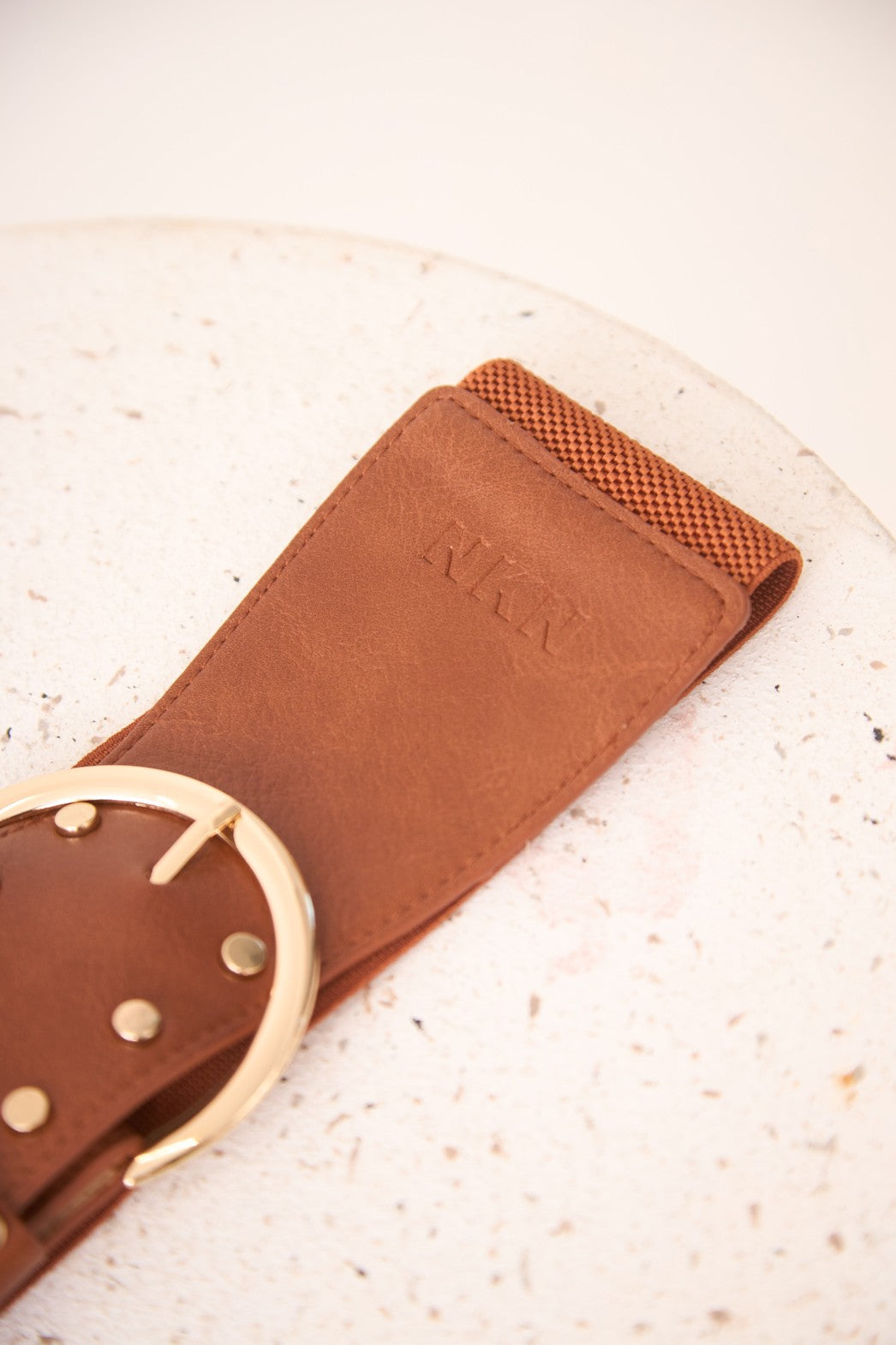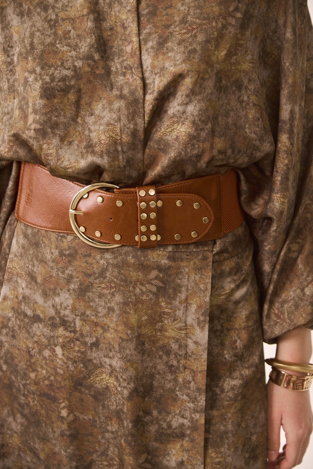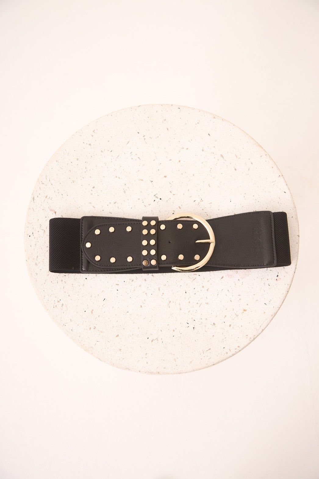 This belt features stylish studs and an elastic waistband for a comfortable fit. It secures with a buckle closure and is available in Black and Toffee.