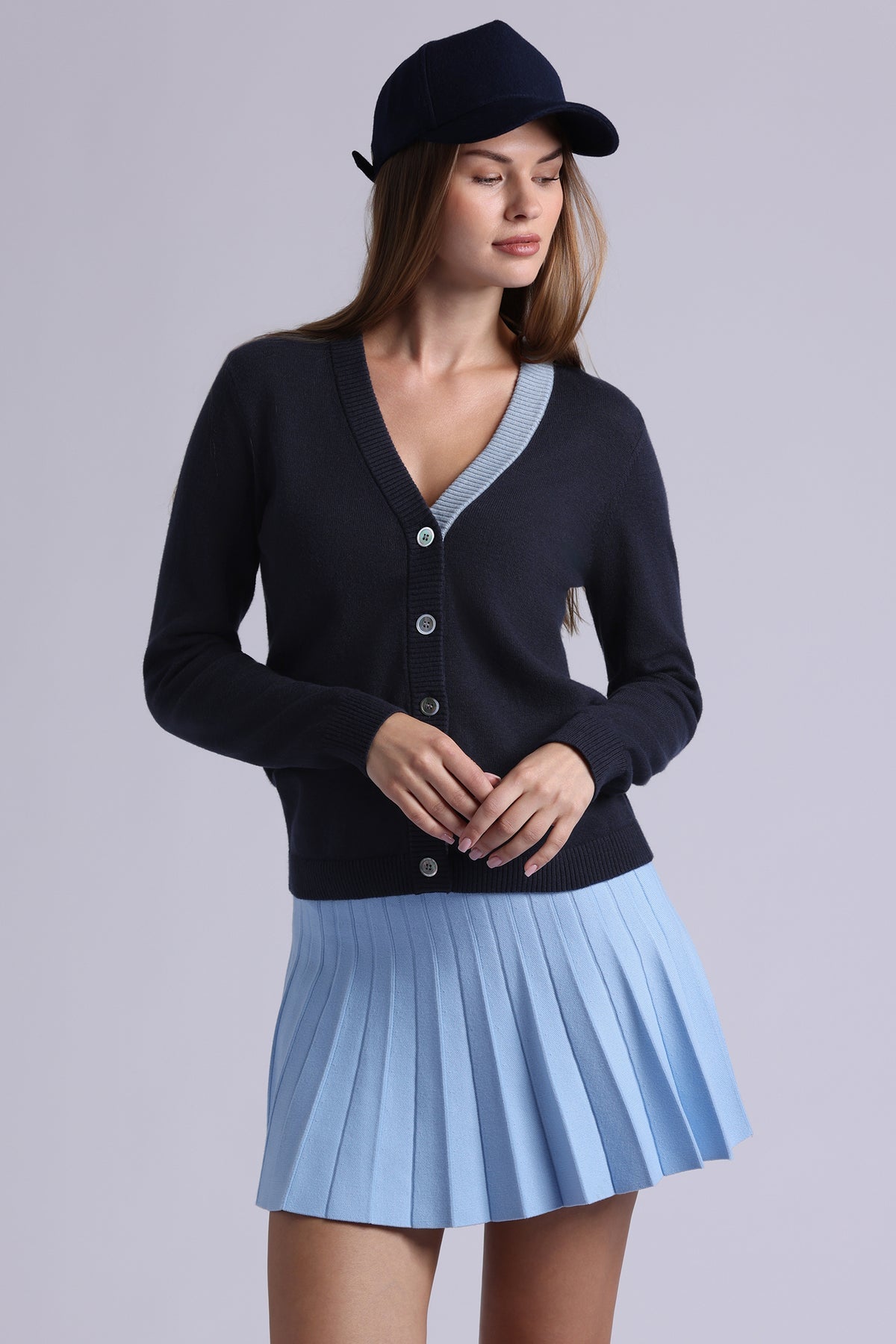 Classic, but make it bold. This V-neck cardi gets a modern upgrade with a contrast placket—proof that timeless can still turn heads. Soft cotton cashmere keeps it cozy, while the details keep it fresh.