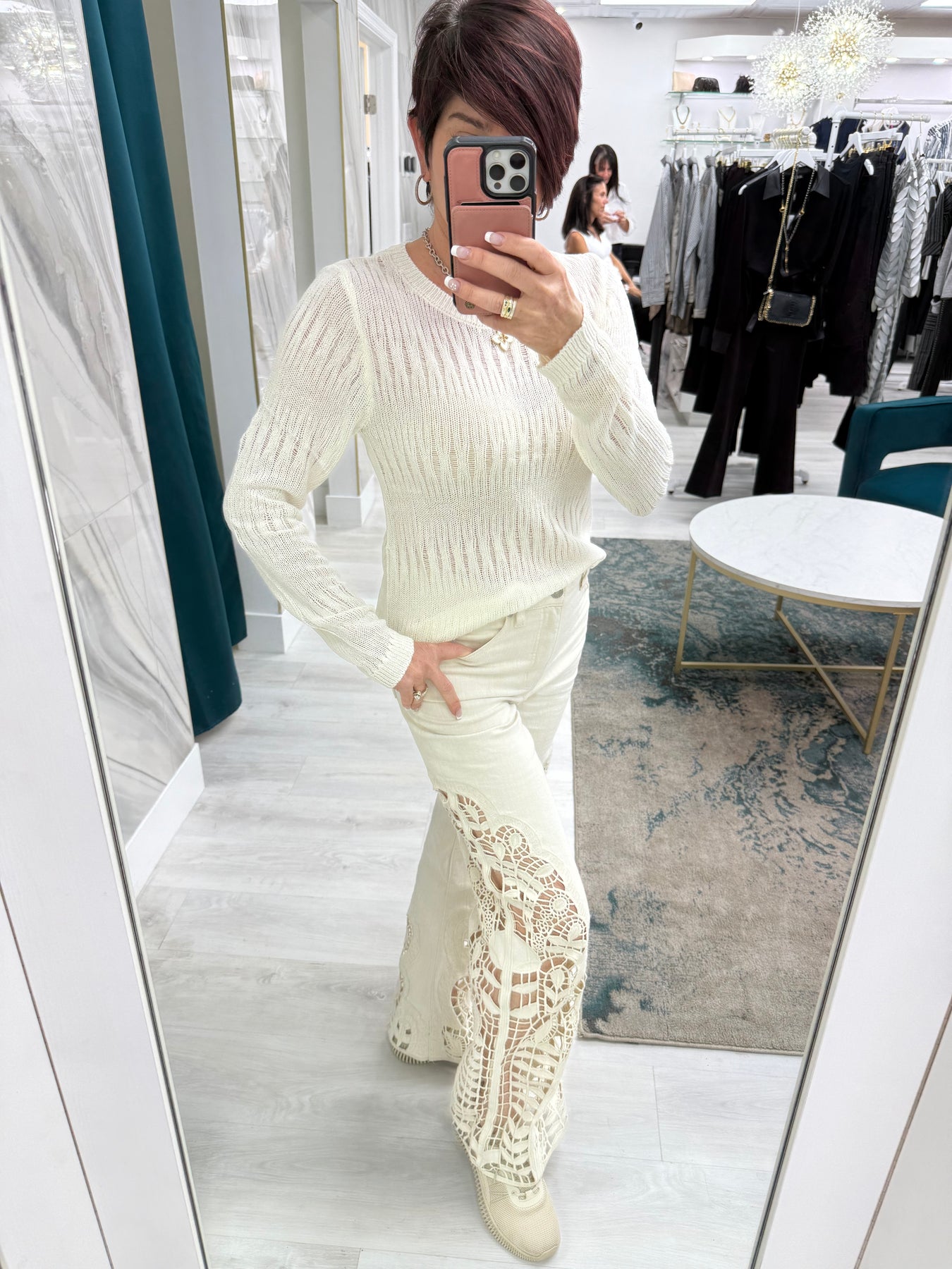 The delicate mesh construction breathes with understated elegance, making it an ideal layering piece for weekend escapes and relaxed gatherings.