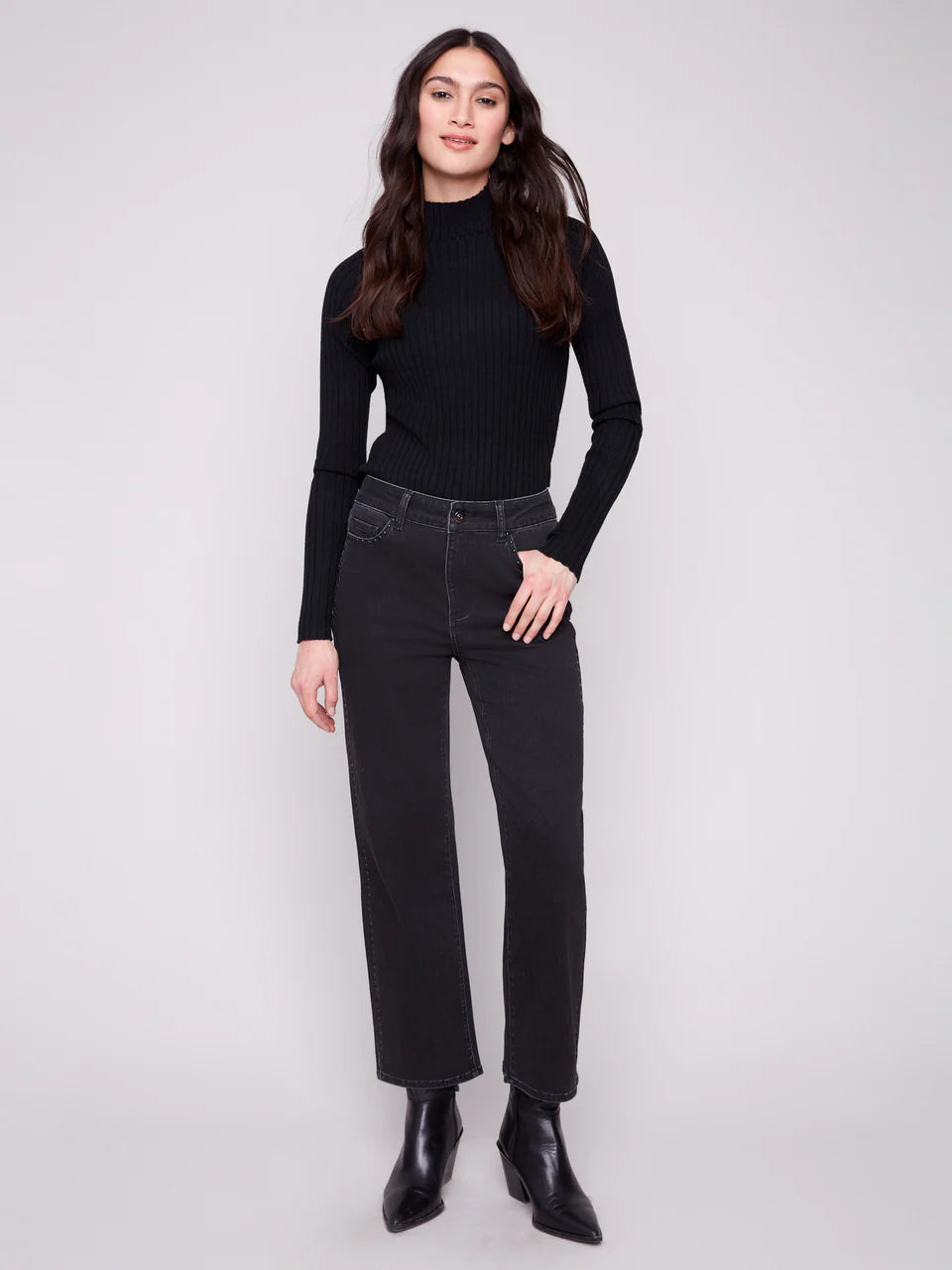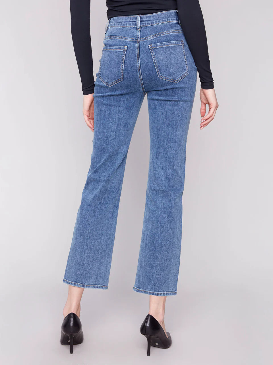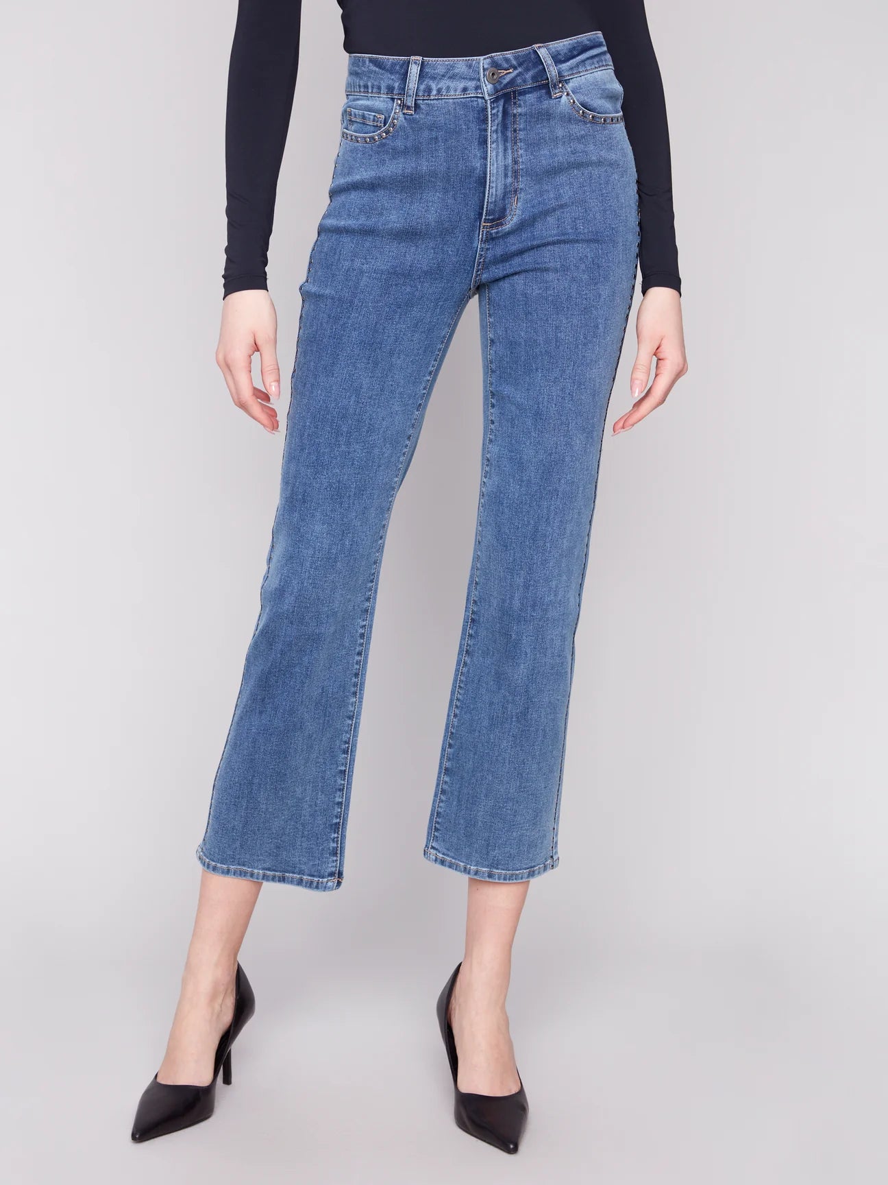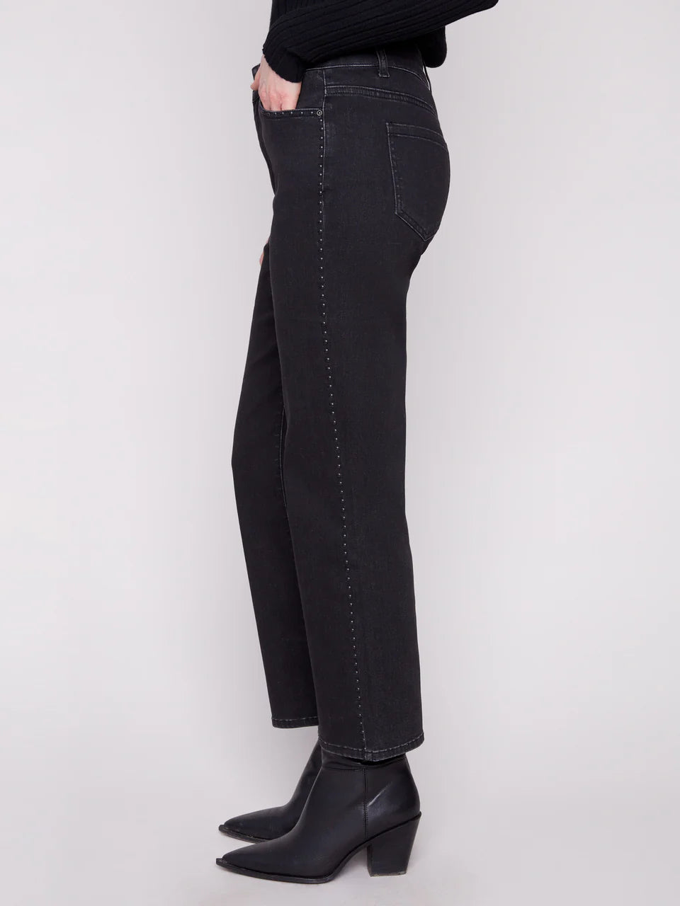 Elevate your wardrobe with these straight leg stretch denim pants, featuring subtle stud detailing along the sides. Designed for both comfort and style, the stretch fabric ensures a flattering fit while the studs add a refined edge to your look. Perfect for sophisticated casual wear or dressing up with ease.