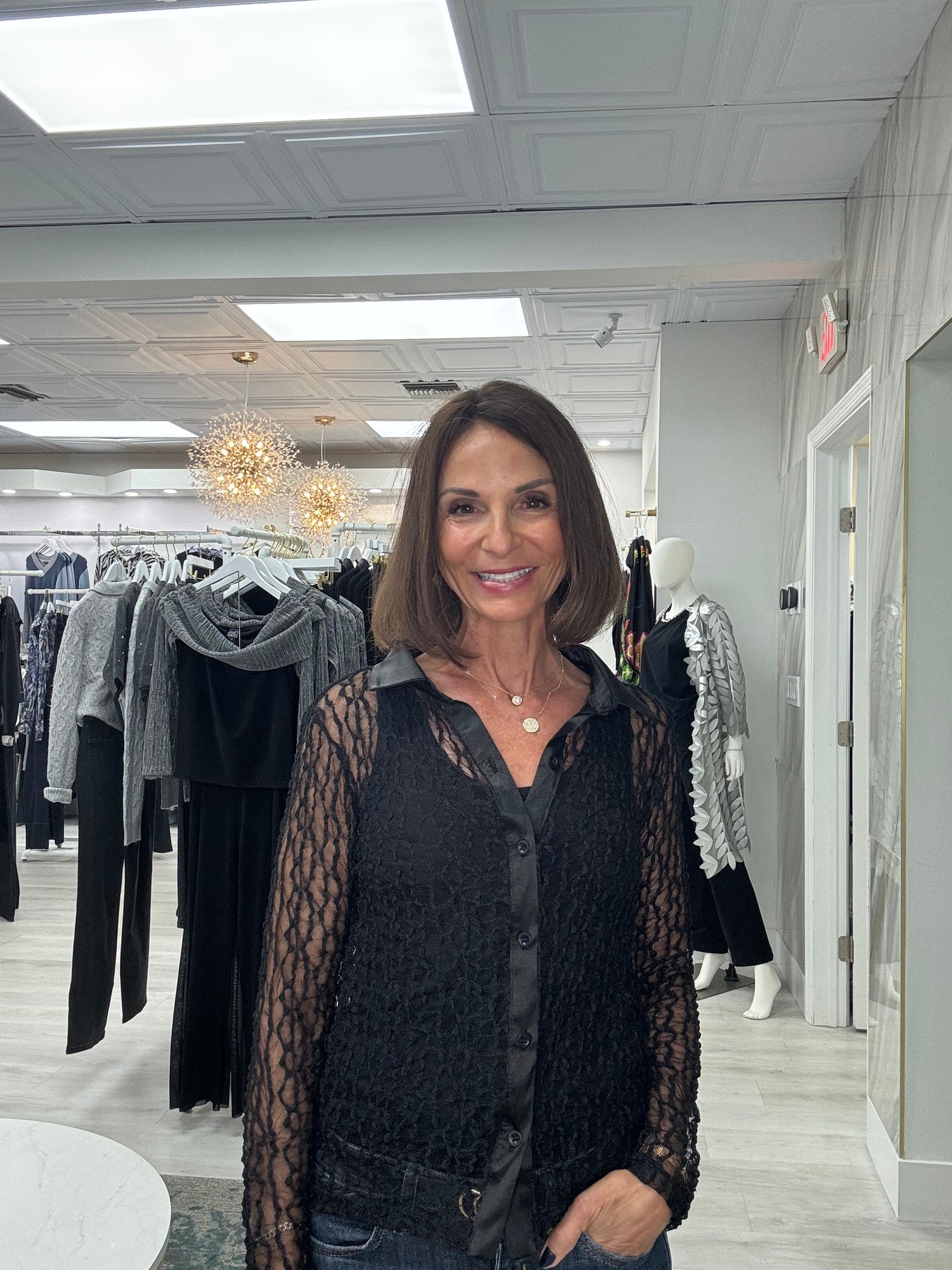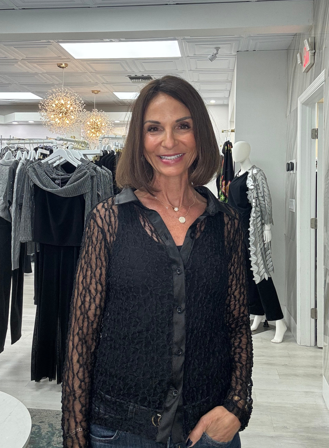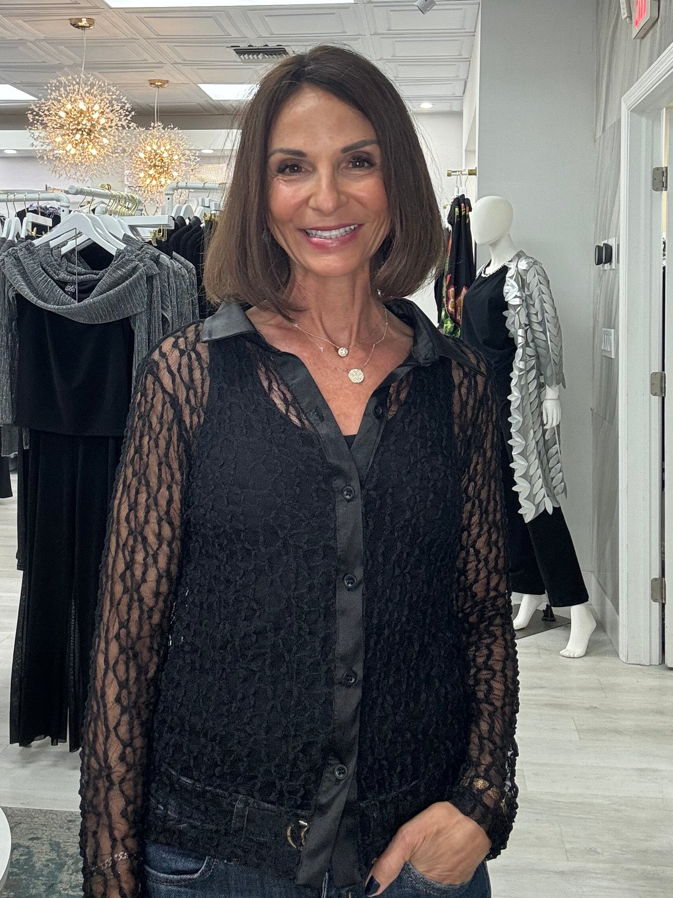 Elevate your wardrobe with this sophisticated black stretch lace shirt, designed for effortless elegance.