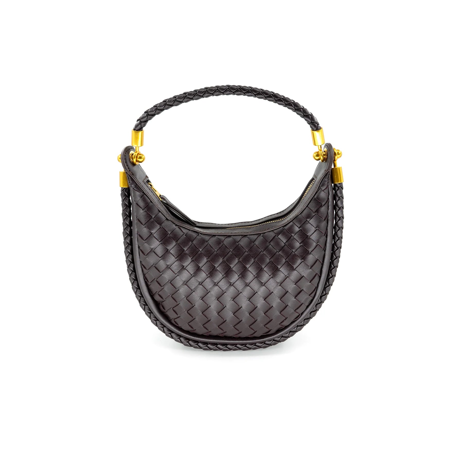 This stylish Mini Woven Hobo Handbag is crafted from high-quality Vegan leather and features a convenient zipper top.