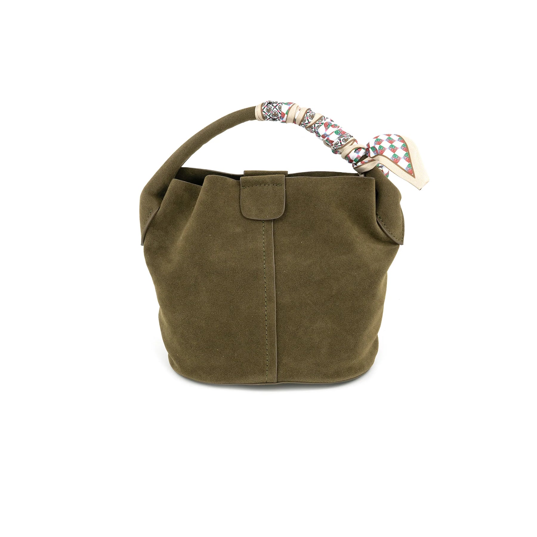 This small faux suede bucket bag measures 9 x 6 1/2 x 5" and is a perfect addition to your fall wardrobe.