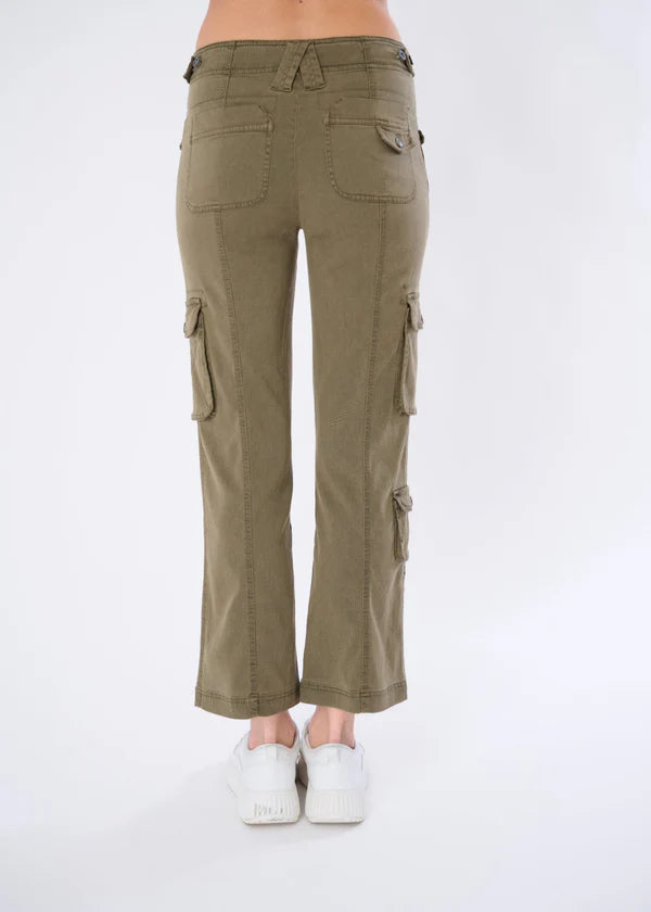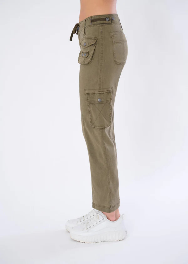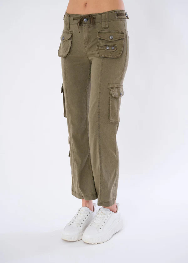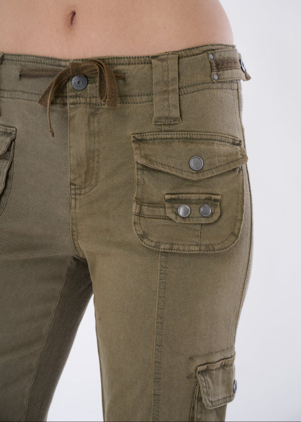 The constructed waistband with an inner drawstring ensures a secure, customizable fit, while snap-button flap pockets on the front, hips, and calf offer practical storage with refined flair.