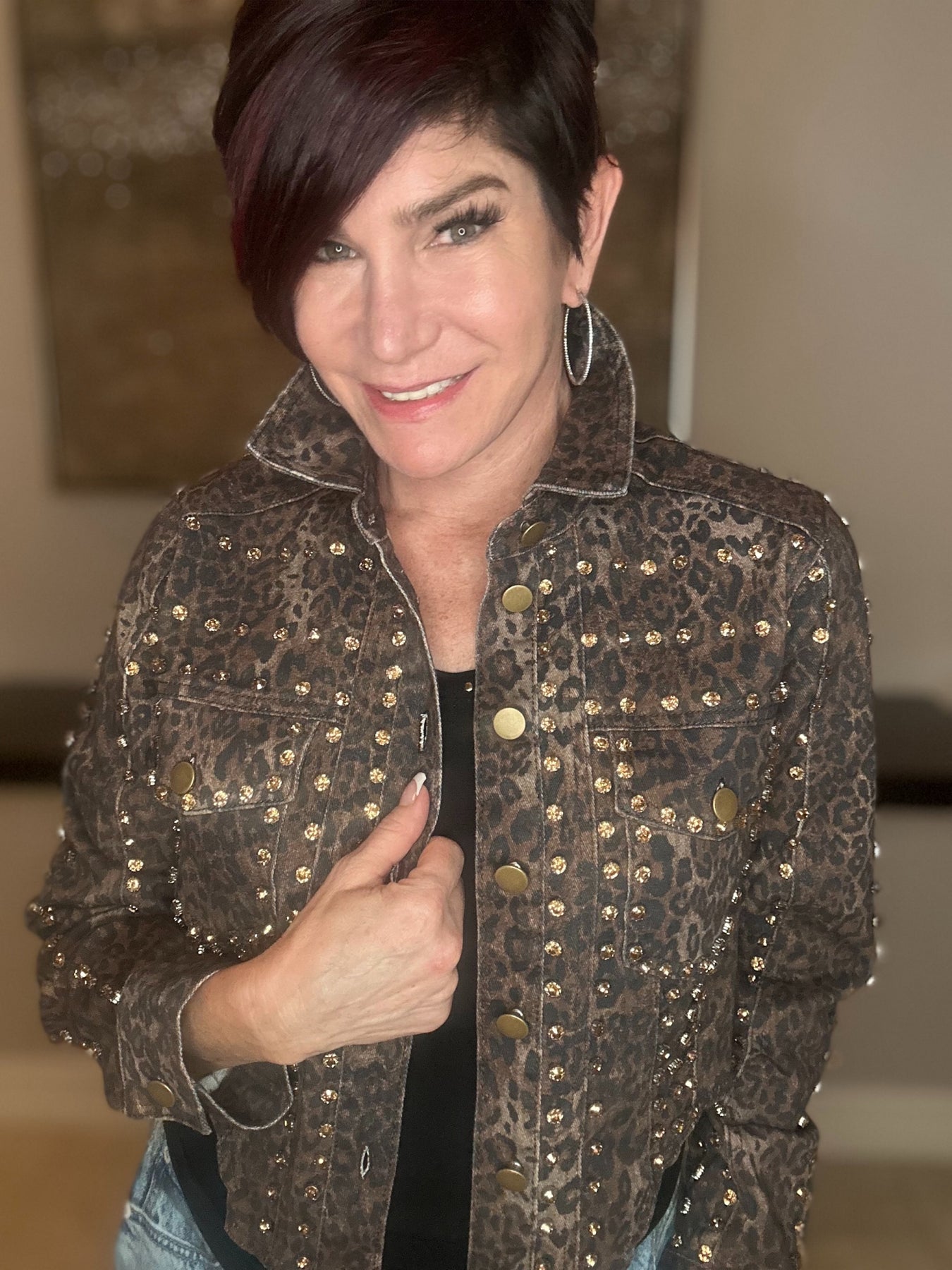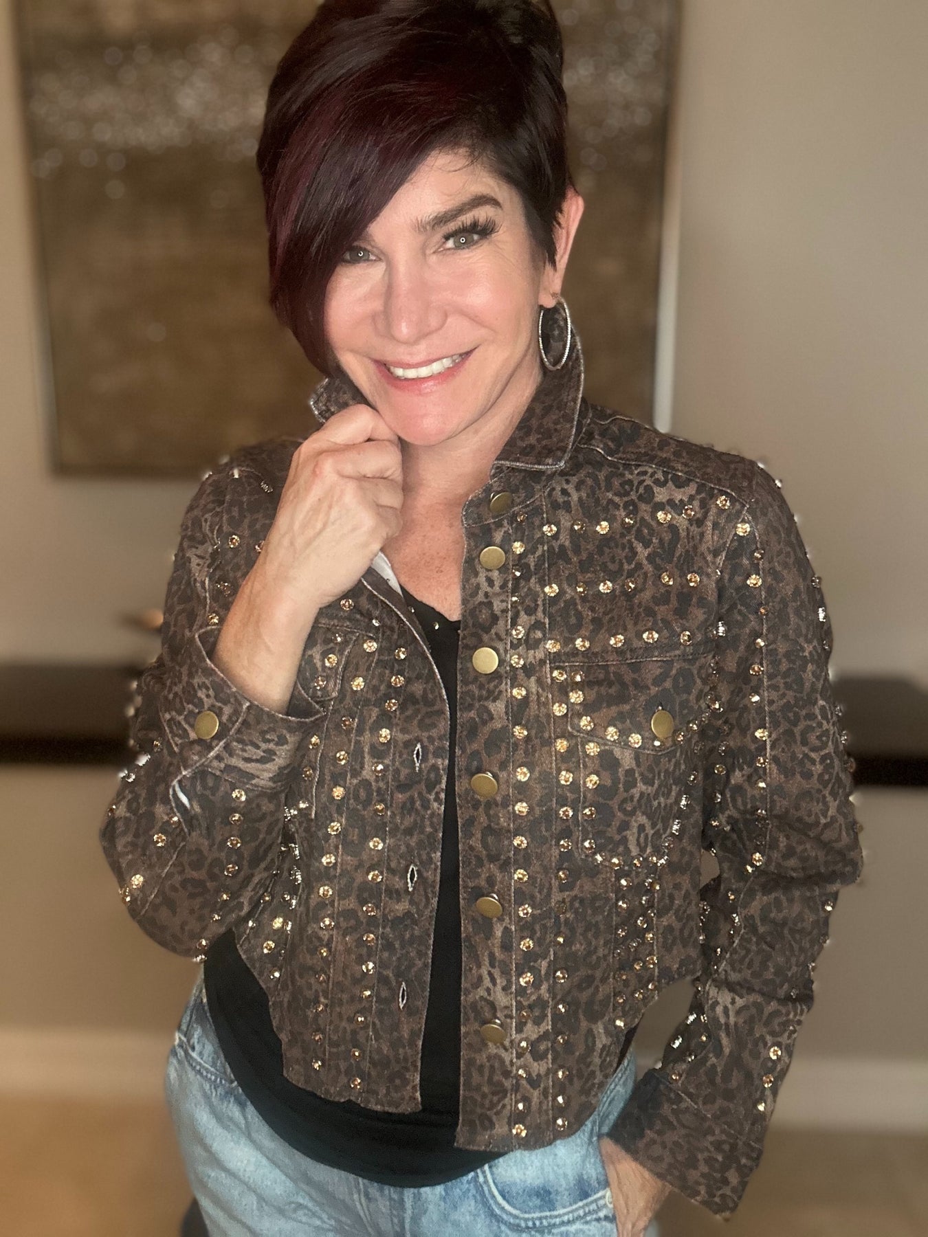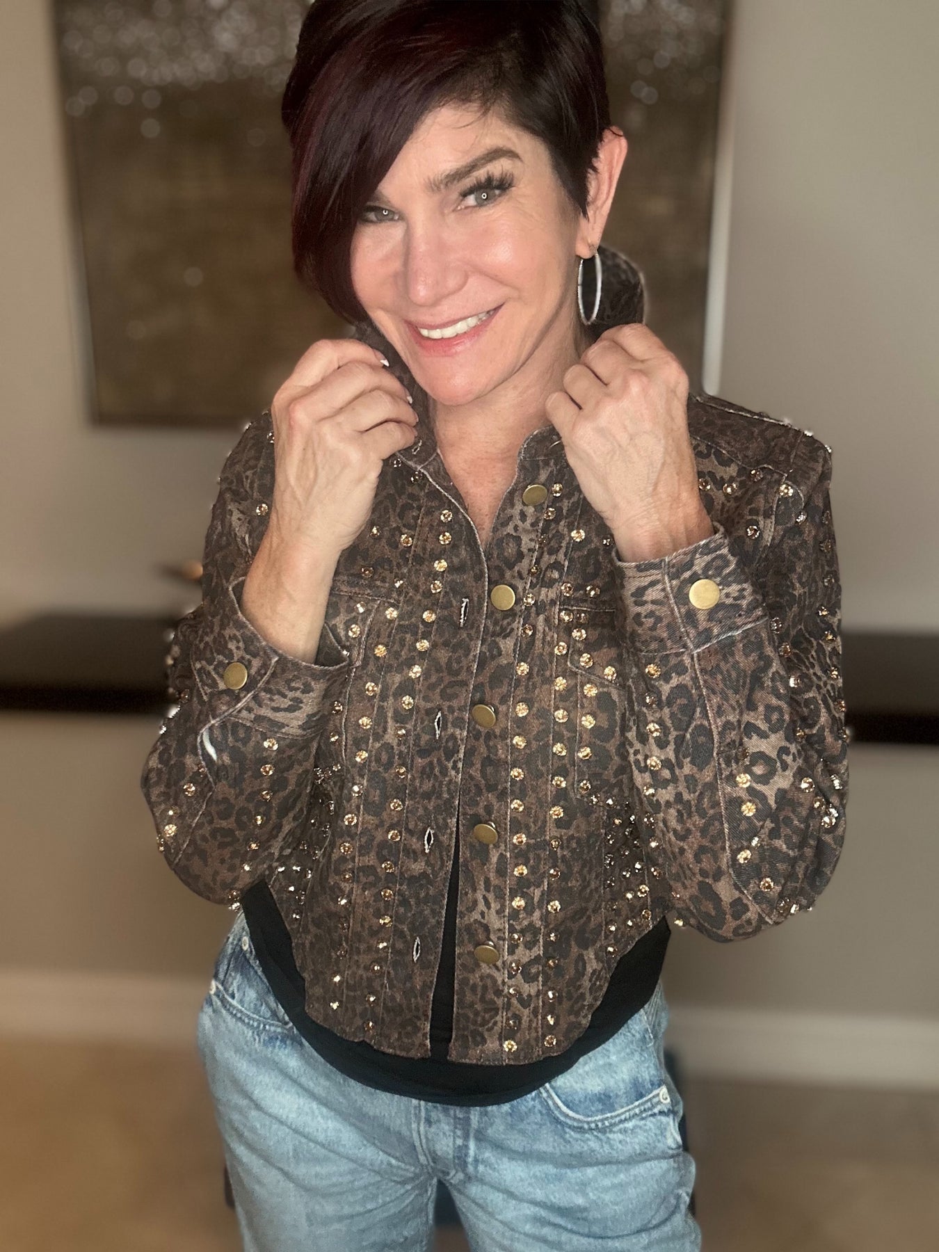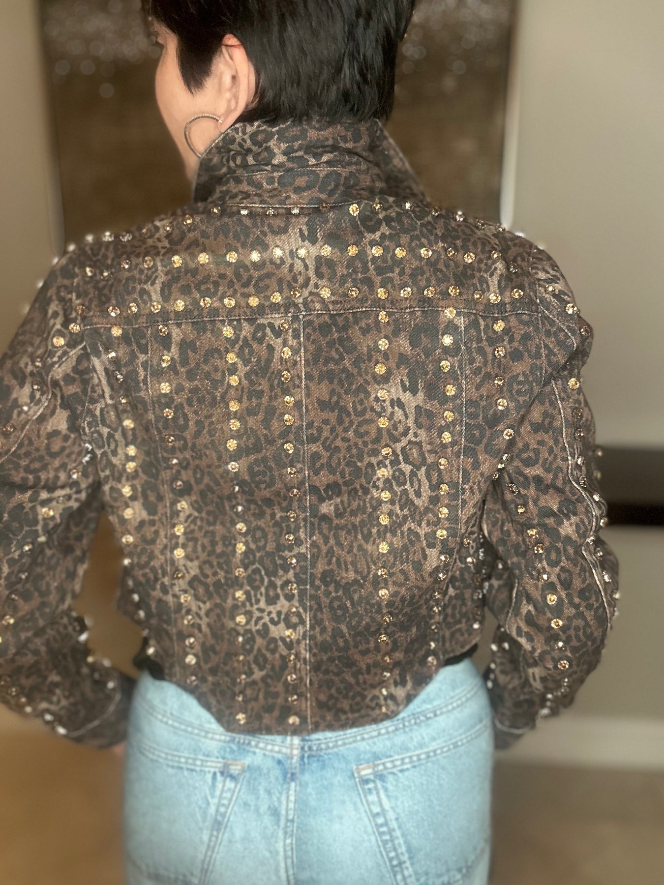 Elevate your wardrobe with the Corrine Animal Print Jacket, featuring a striking leopard pattern adorned with shimmering topaz-colored rhinestones on both front and back.