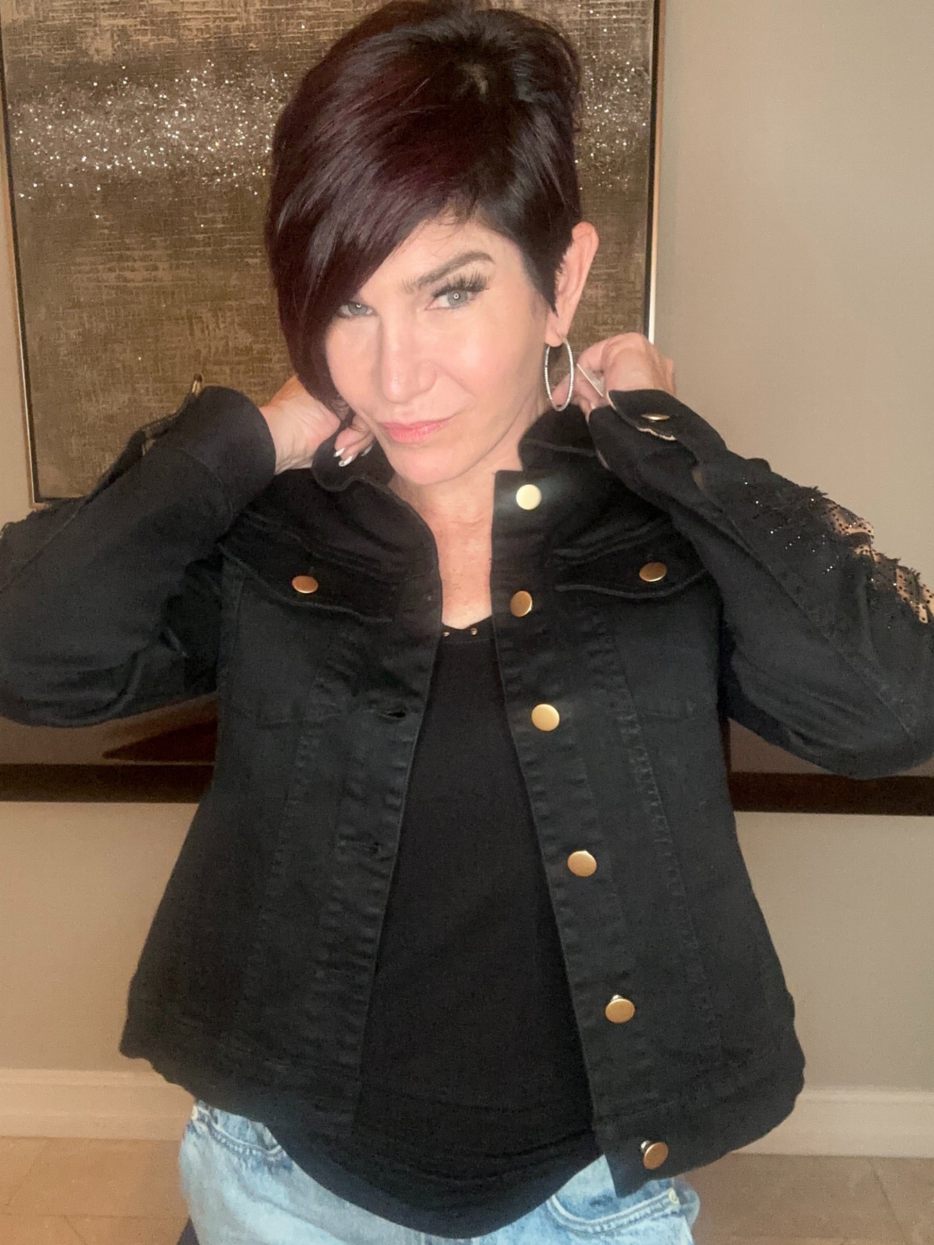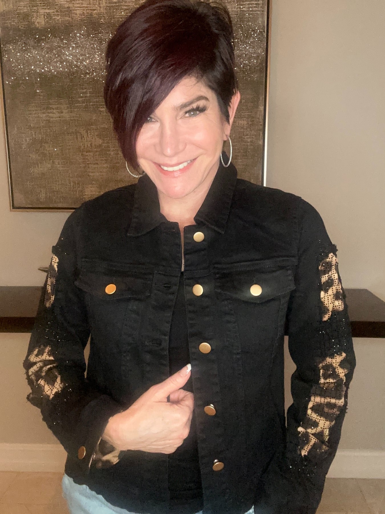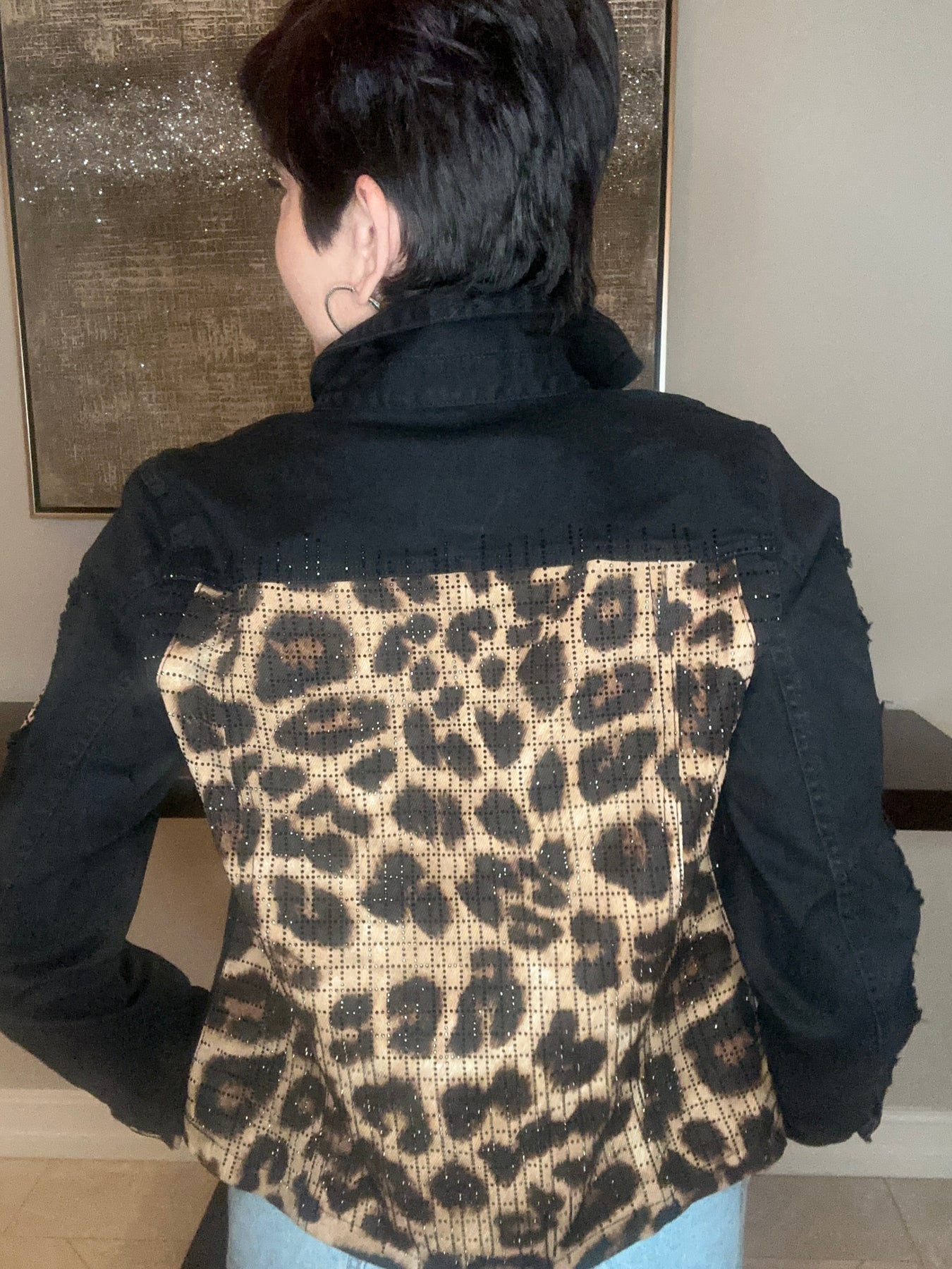 Elevate your wardrobe with the Jenny Black Leopard Stone Detail Jacket, featuring distinctive leopard fabric accents along the arms and back.