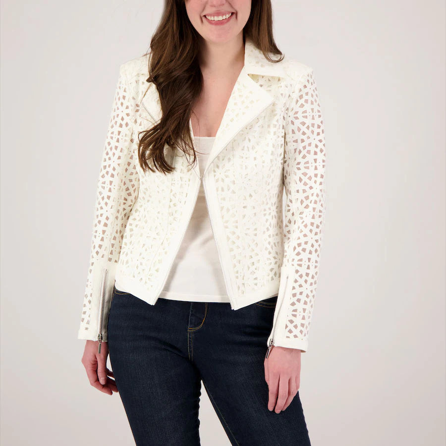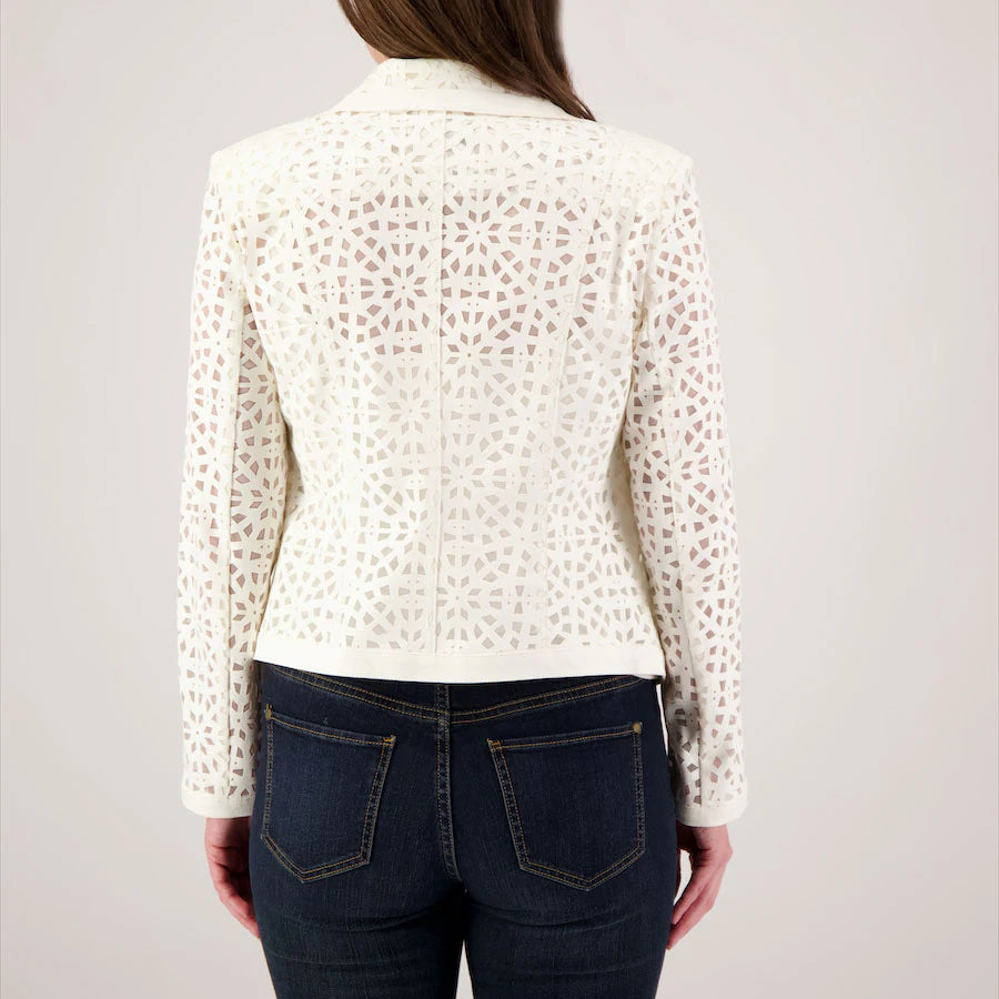 Add a touch of luxury to your wardrobe with our NOVELTY JACKET. This elegant, collared jacket features a unique lasered cut design with intricate mesh detailing, creating a fashionable and sophisticated look. The zip-up closure adds a practical element, making it perfect for any occasion. Elevate your style with this exclusive piece.
