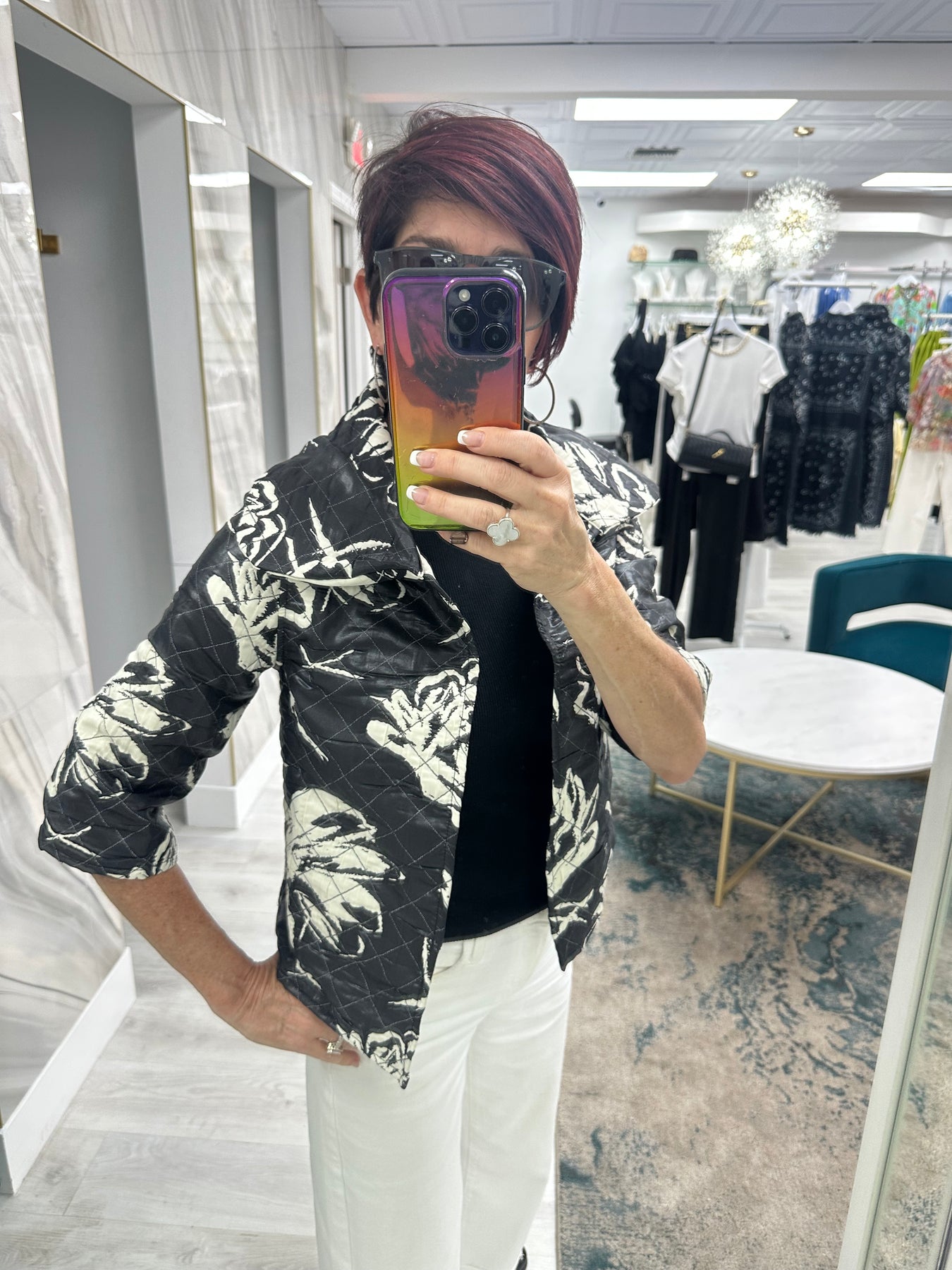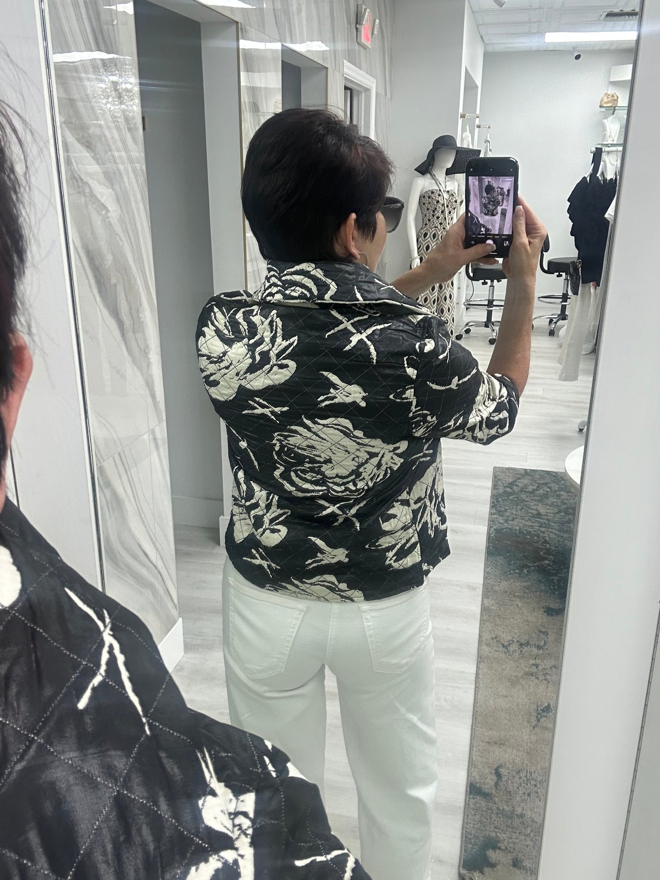 Elegant reversible jacket in black and white with lightweight quilted design, crafted from 100% poly fabric.