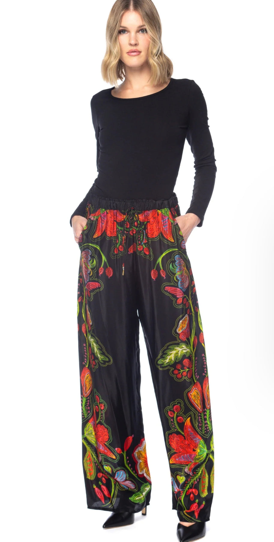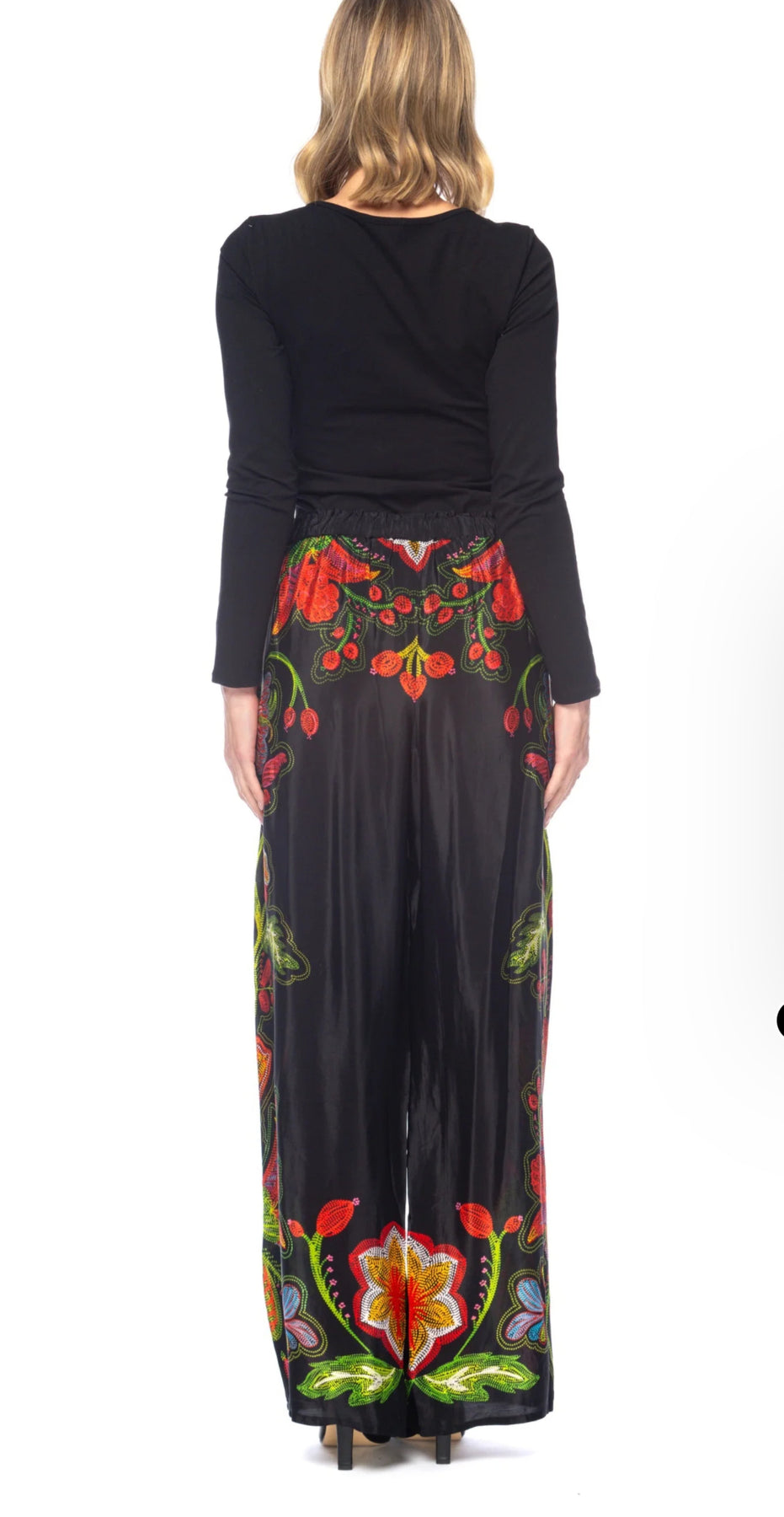 Make a bold statement with the Fabiola Sable Pants. Crafted from a soft, flowing fabric, these wide-leg pants feature a vibrant, hand-drawn floral print that pops against a deep black background. The elastic waistband with adjustable drawstring ensures a comfortable, flattering fit, while side pockets add everyday functionality. Effortlessly pair them with a simple black top for a chic, relaxed look that transitions seamlessly from day to night.