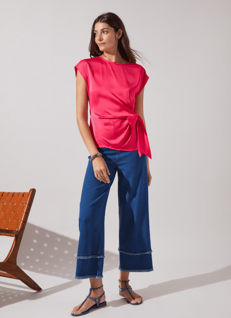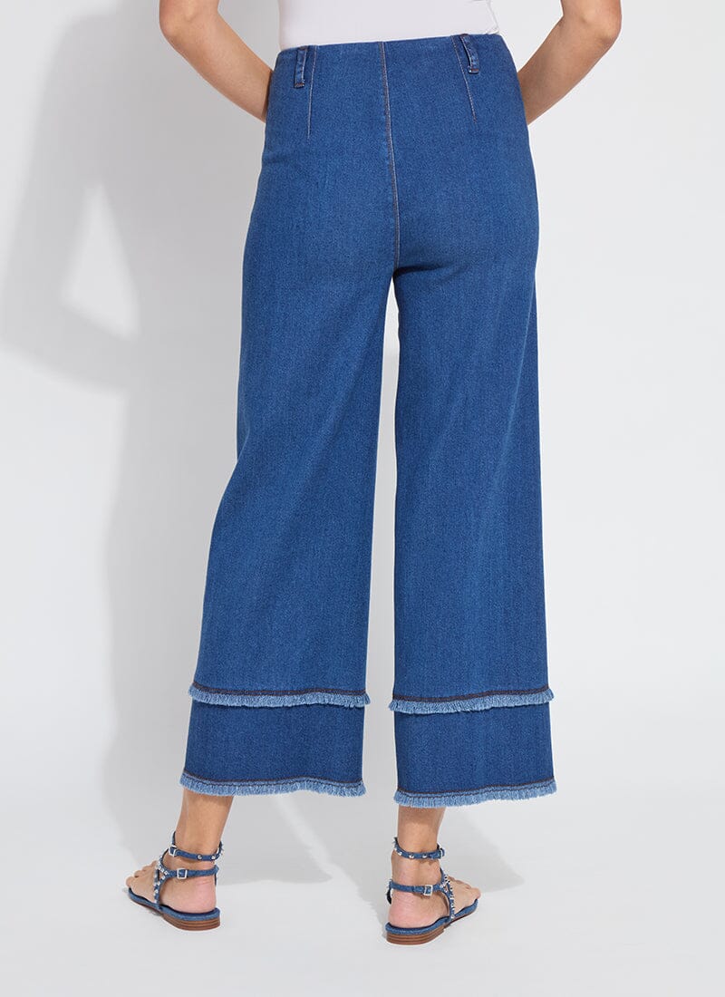 Crafted from eco-friendly Lenzing St Tencel Drapey Denim, our Fringe Hi Waist Wide Leg Crop Denim exudes elegance and sophistication. This luxurious fabric boasts softness and 2-way stretch, derived from natural raw-wood sources and produced in a sustainable, closed-loop process. These wide-legged palazzo jeans feature a concealed 360° smoothing waistband and a clean front without side seams, resulting in a sleek and linear appearance. Details such as beltloops, side and back darts, and a bottom panel adorned with hand-woven fringe add a touch of artistry to the design. For added softness, the denim is garment washed, making it a perfect match for airy tees and our Rosalia Tie Drape Mix Media Top. Embrace premium style with Lyssé.