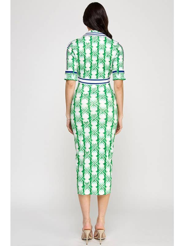 Elevate your wardrobe with our Button Down Short Sleeve Midi Dress. Crafted from a stretchy soft knit fabric, this collared dress features a front sexy slit and half sleeve with cuffs detail. Perfect for any occasion, it is designed to flatter all body types. Available in sizes Small to Large. Made in China from a luxurious blend of 95% polyester and 5% spandex.