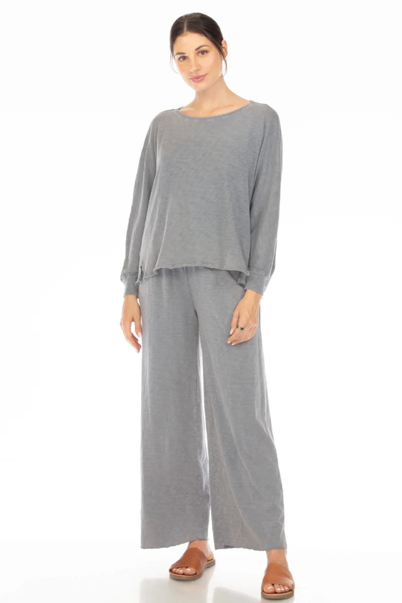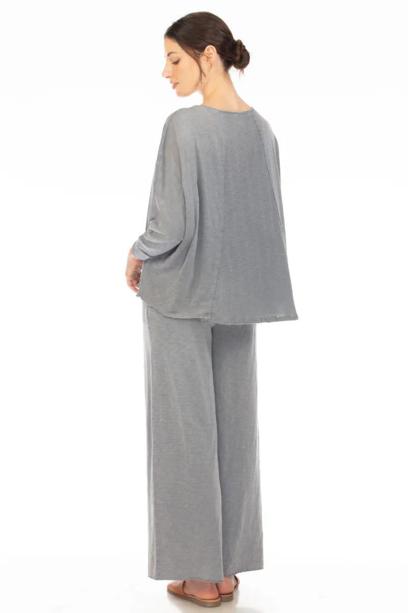This stunning top features a flattering dolman silhouette that drapes beautifully, paired with extra rigged lines strategically placed down the back center.