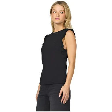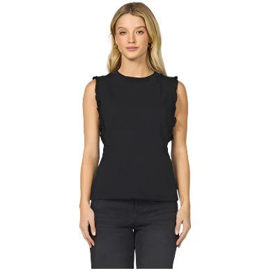 Its sleeveless design with subtle suede ruffle details adds a touch of sophistication, making it perfect for both polished evenings and effortless daytime looks.