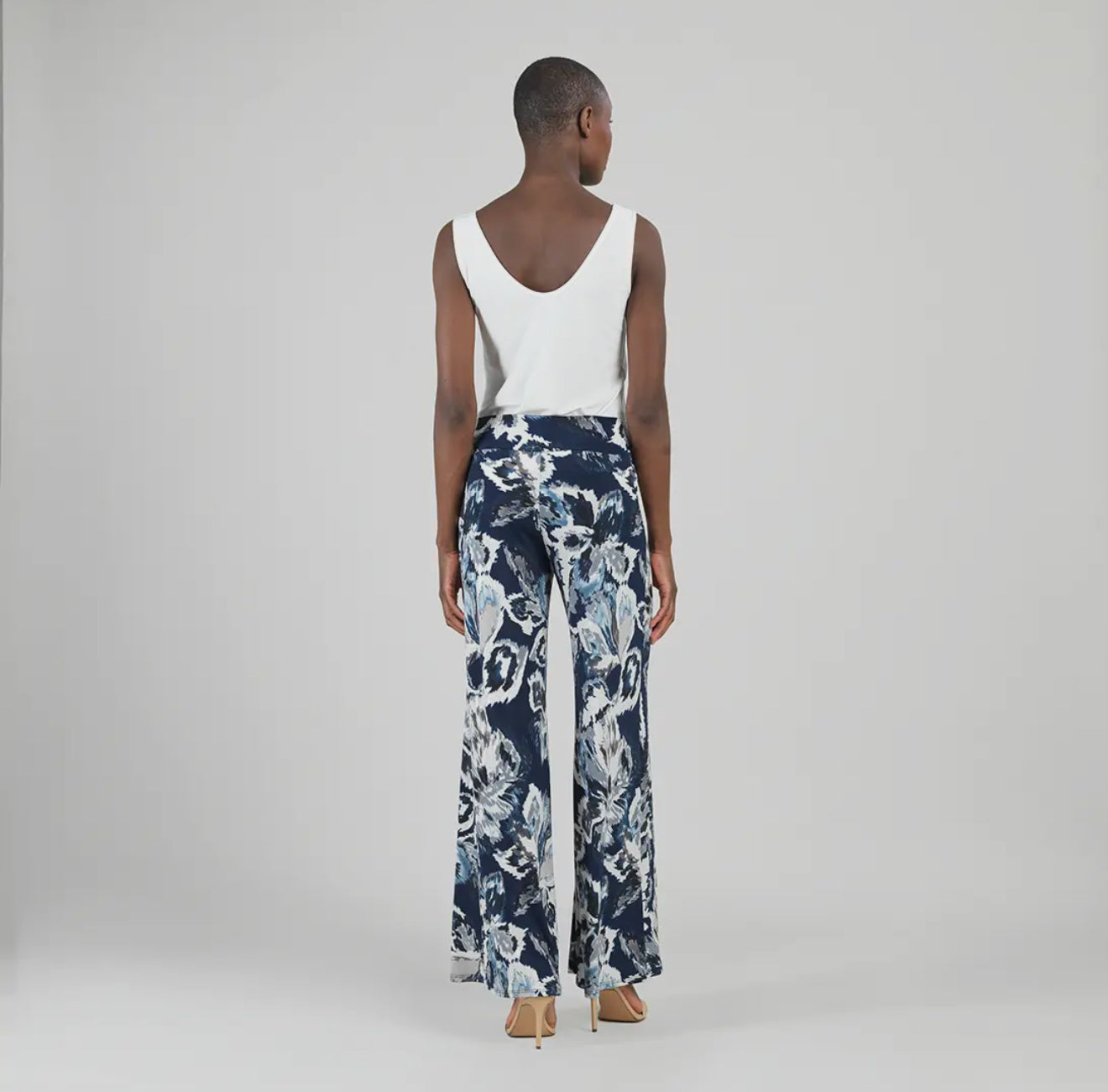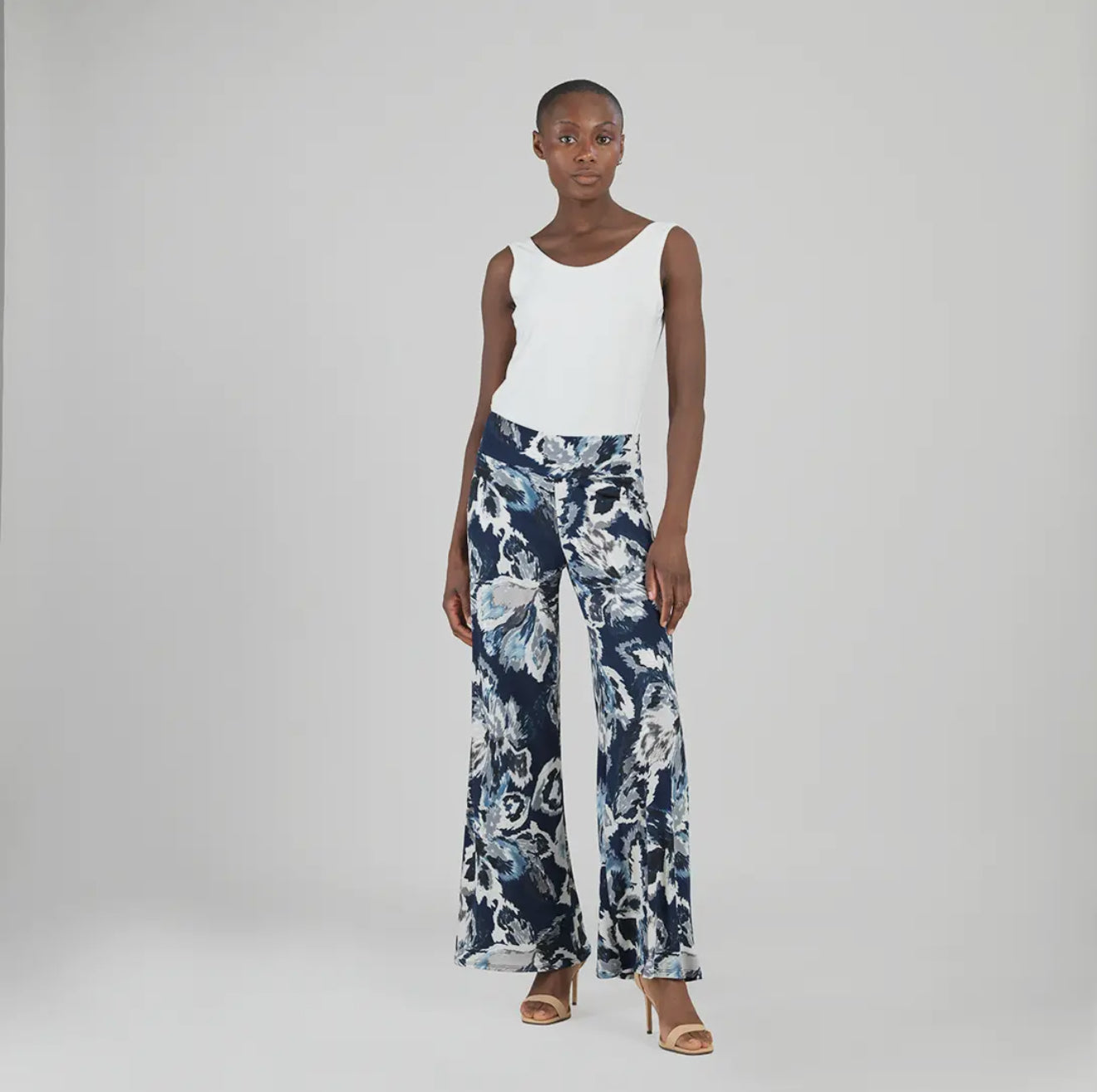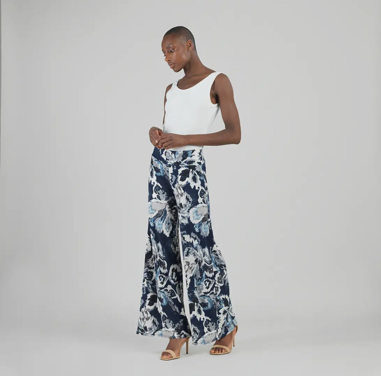 Indulge in the sophisticated elegance of our Moonlit Floral Palazzo Pant. Made with a 3 inch pull-on waistband and travel-friendly, non-wrinkle fabric, these palazzo pants offer an ultra flattering silhouette with a wide leg design that gracefully drapes against the body. The deep navy color is adorned with a romantic brushstroke print in icy blue, gray, and beige tones, delicately accented with silver foil details. Crafted from ultra lightweight and breathable fabric, these pants are the epitome of luxury and comfort.