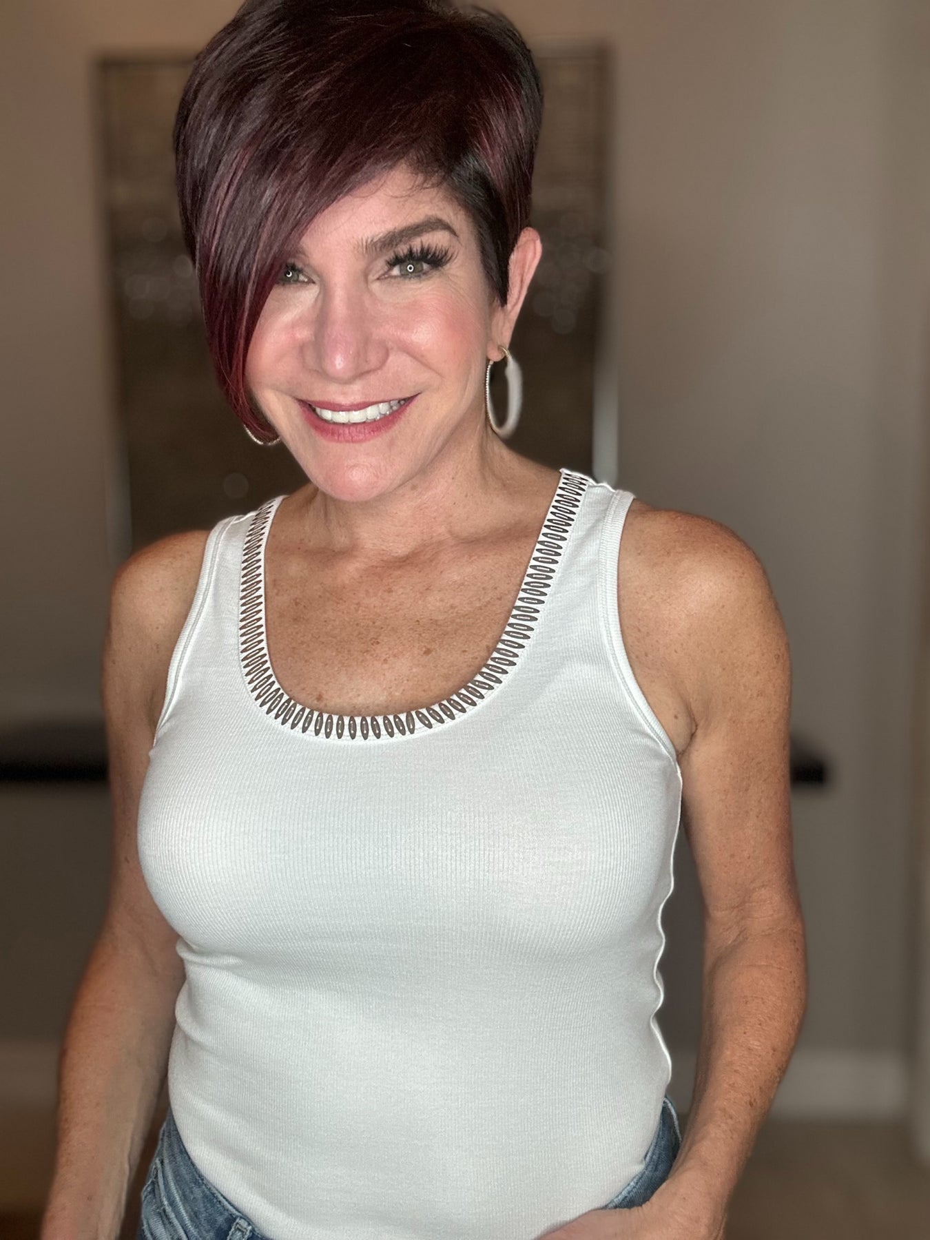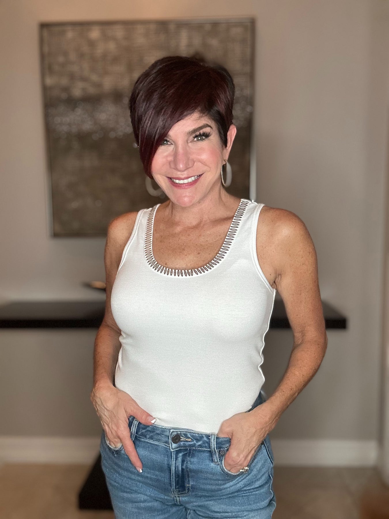 Elevate your essentials with this refined white ribbed tank top. The shimmered trimmed collar adds a subtle touch of elegance to this versatile piece. Crafted from a premium blend of cotton, modal, and spandex, it offers both luxurious comfort and a flattering silhouette that maintains its shape throughout the day.