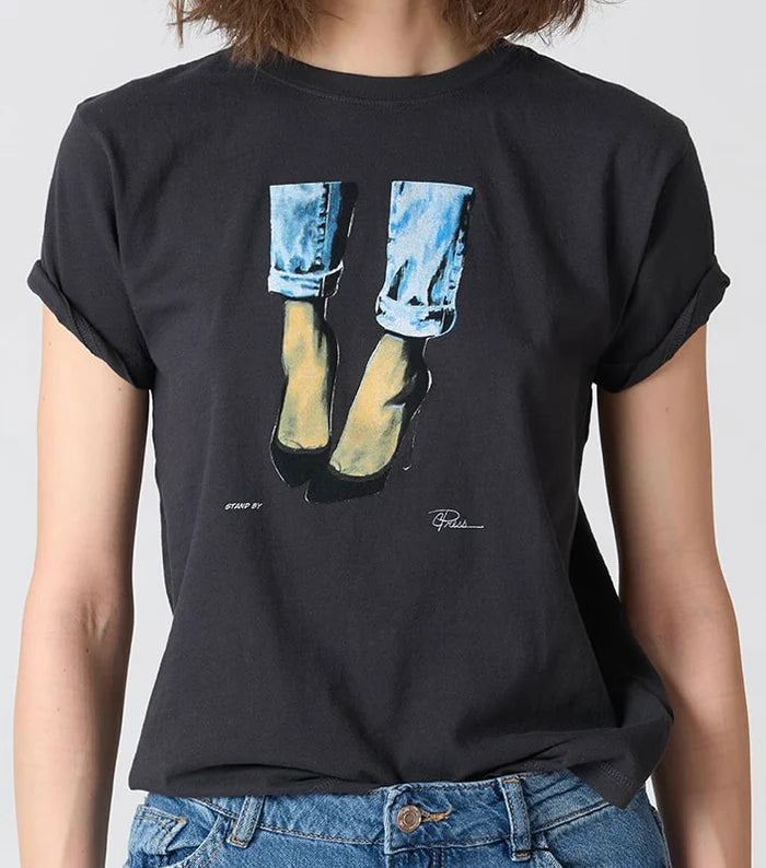 Jeans, heels and a hint of color is what my "Stand By" painting is all about. Take your t-shirt game up a notch by wearing this one under or on top of your favorite white, blue or black denim! It's just the detail you need to boost your look.