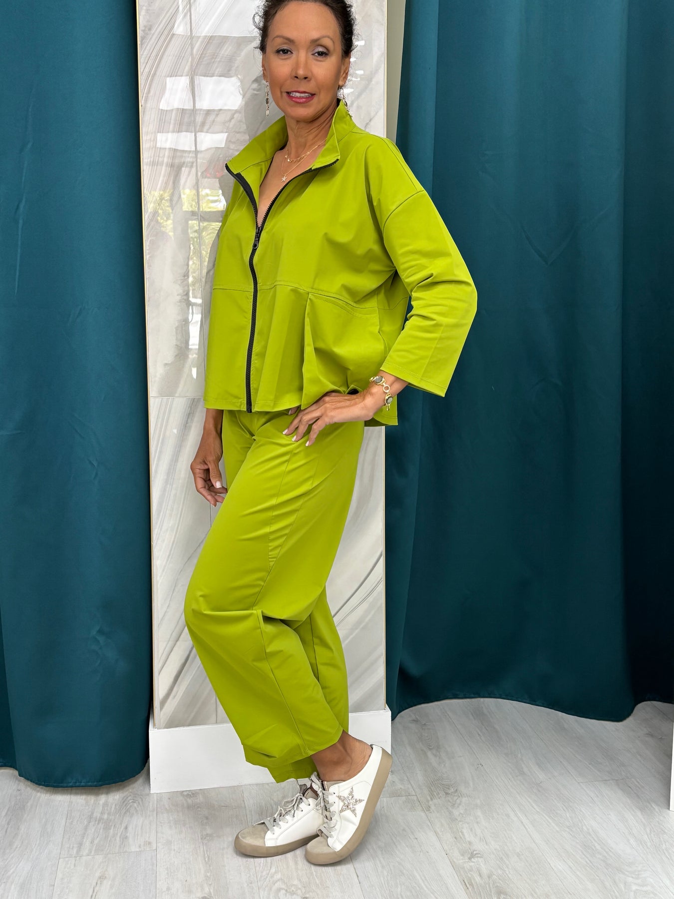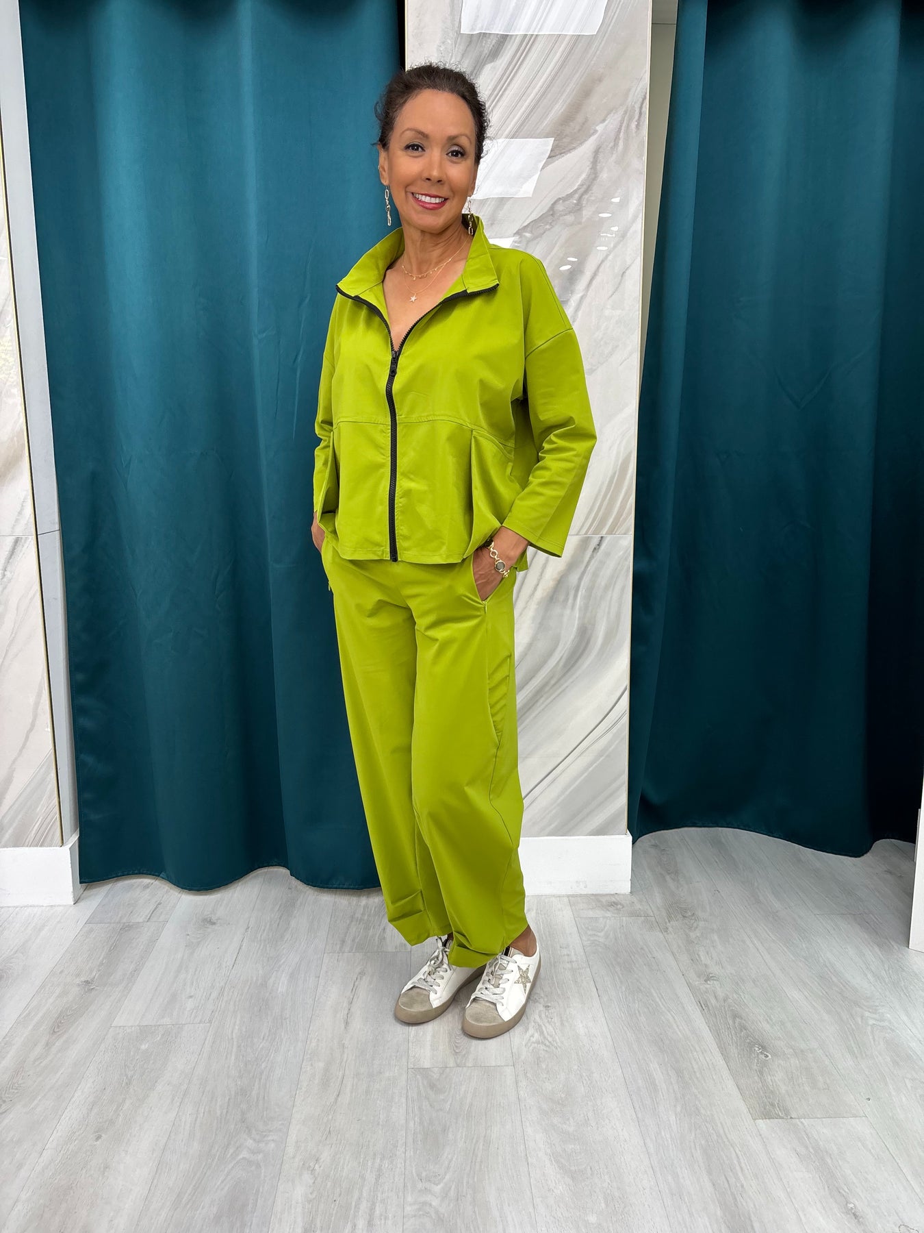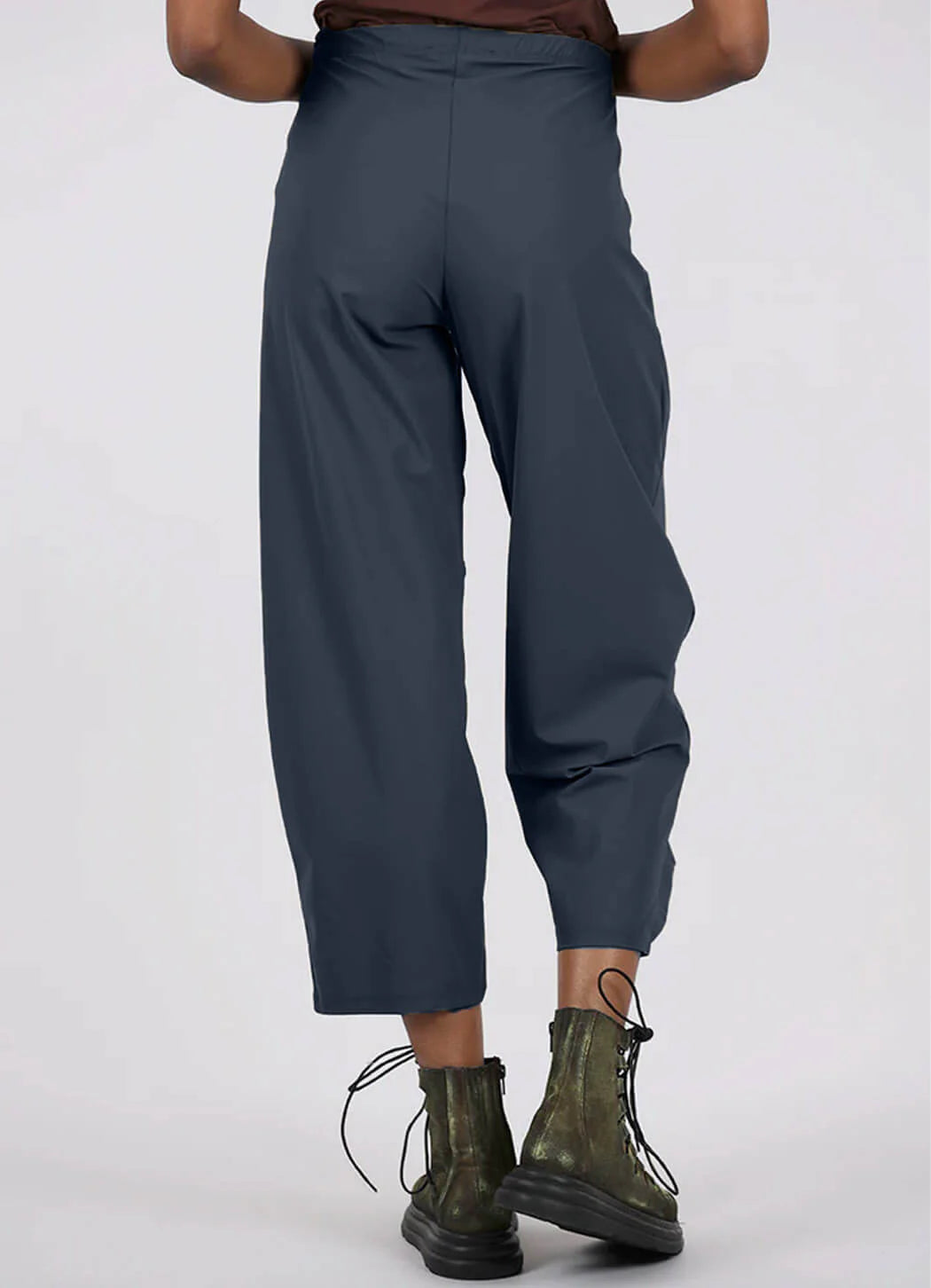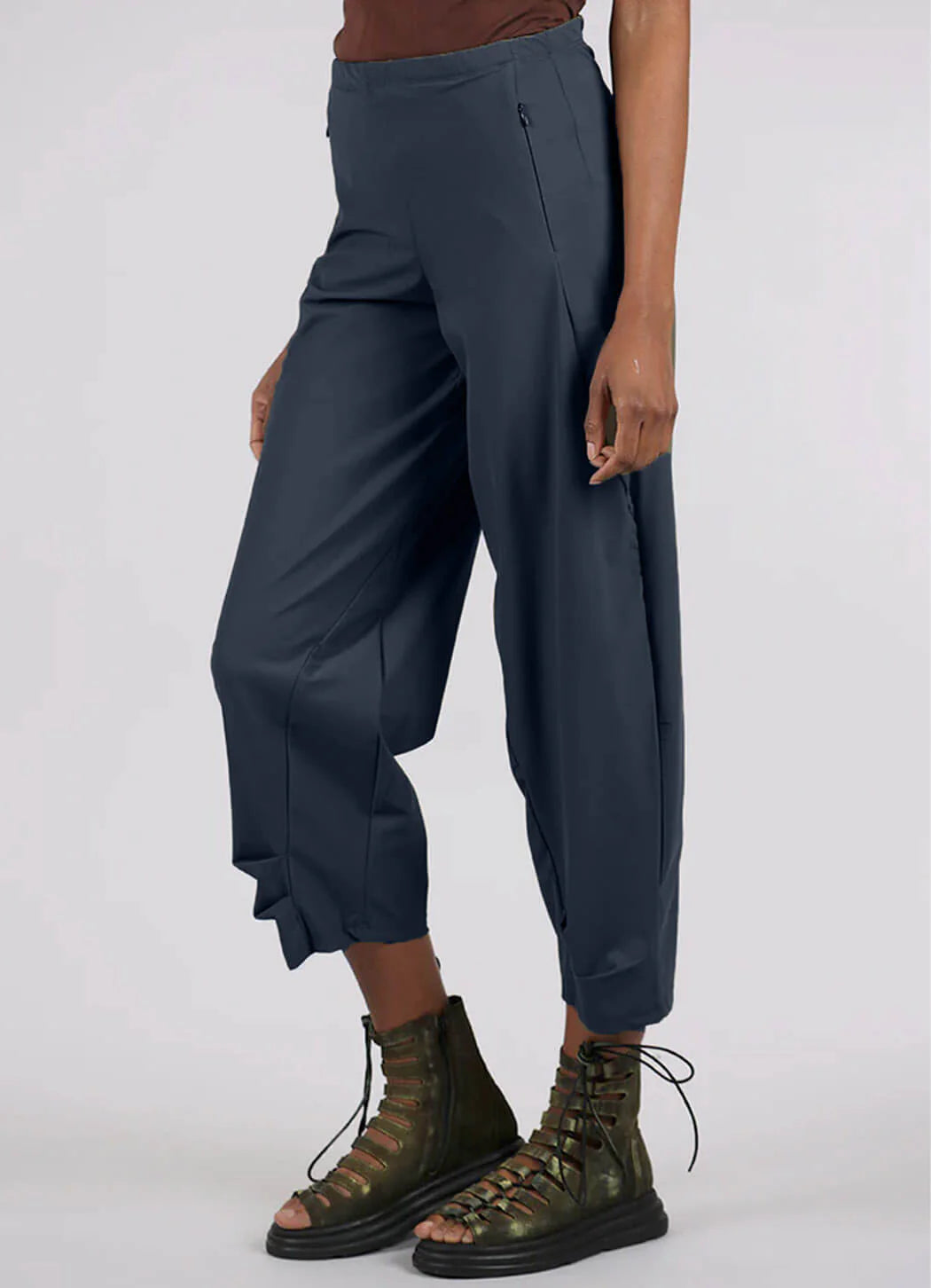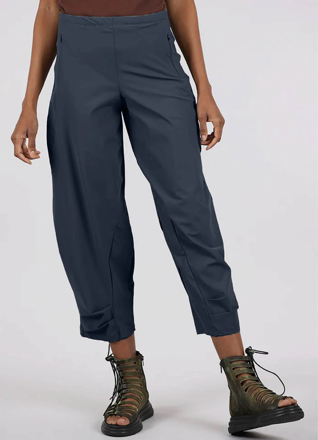 These pull-on pants showcase a flat elastic waistband and zippered pockets for effortless functionality.