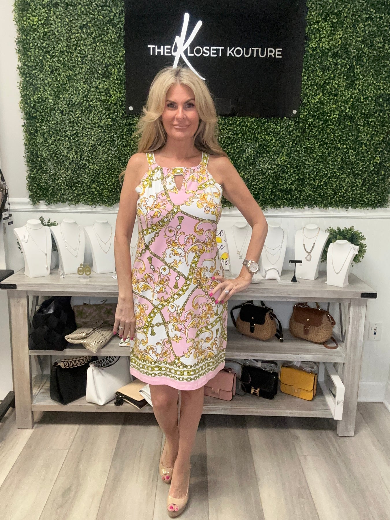 Get ready to turn heads in the Adela Keyhole Dress! Featuring a playful scroll design on a pink background, this knee-length dress is both stylish and comfortable thanks to its shift style. The unique keyhole design gives the top a halter look, perfect for any occasion.