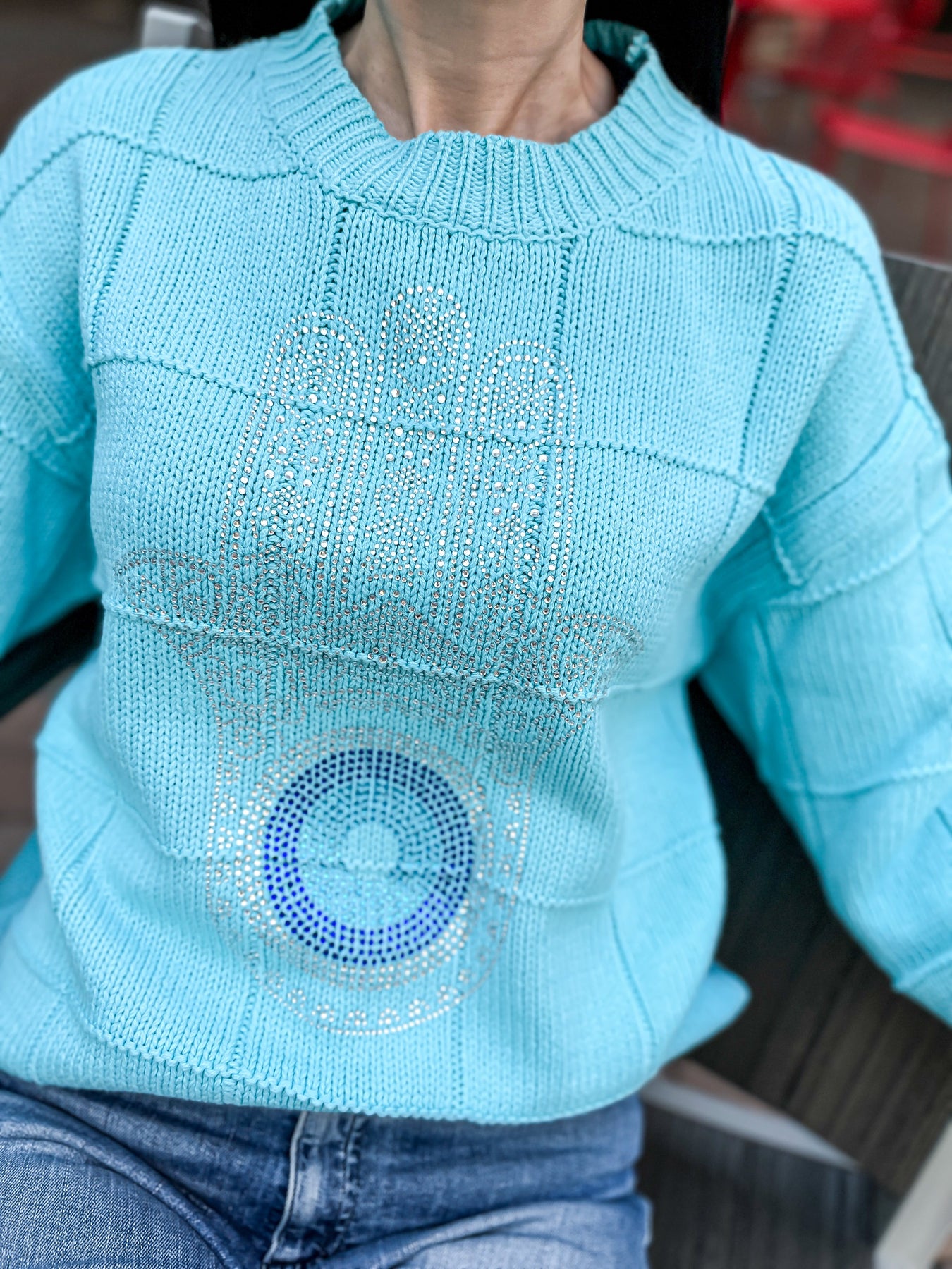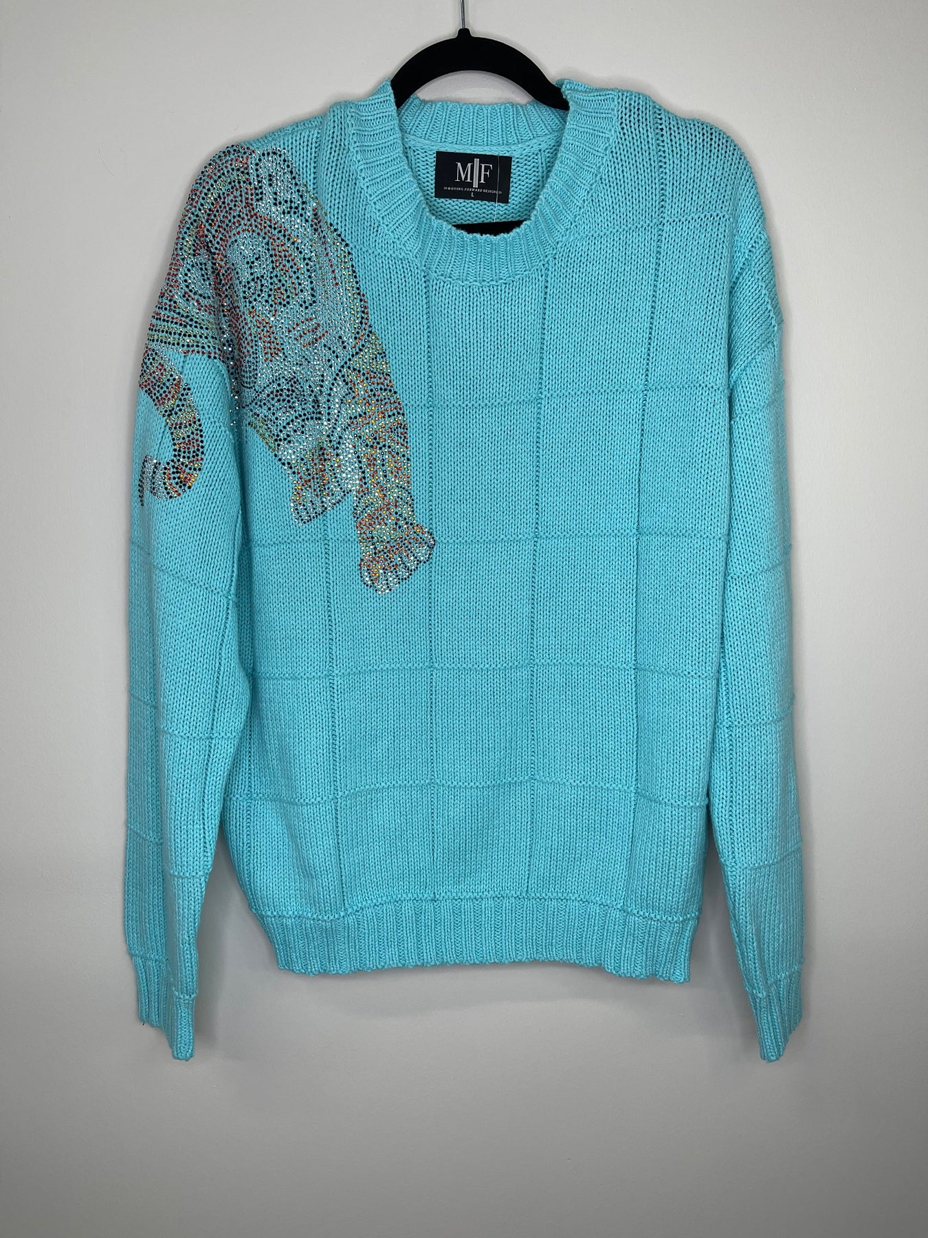 This cotton sweater features a stunning diamond stitch pattern and unique embellishments. The relaxed fit makes it suitable for sizes ranging from small to medium (6-8) and large (12-14).