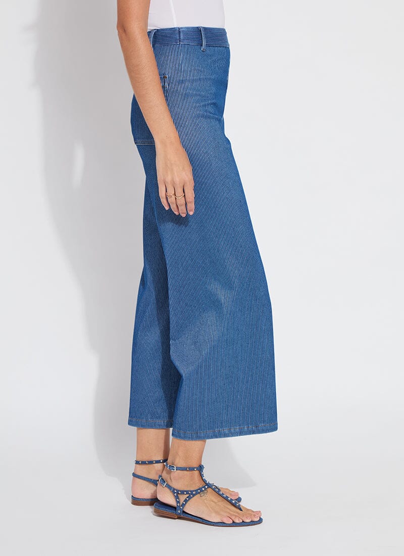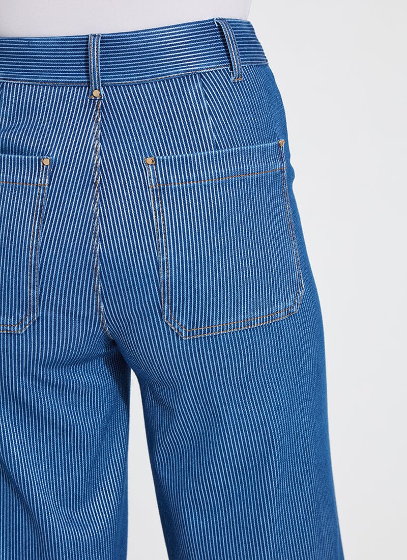 Indulge in the luxurious feel of our Erin Hi Waist Wide Leg Denim (28" Inseam), crafted from 4x-stretch Knit Denim featuring a vertical sheen created by polyester fibers. These high-waisted jeans boast a concealed patented waistband, stylish back patch pockets with gunmetal studs, beltloops, and topstitching. With an extra-wide leg and no side seams, the Erin High Waist Wide Leg Denim showcases a cropped, ankle length and raw-edge hem that can easily be shortened. For a sophisticated and exclusive look, pair these wide-leg jeans with the Bianca St Tencel Chambray Short Sleeve and your favorite sandals. • Lyssé concealed patented 360° smoothing waistband • 4x stretch • Knit Denim: 46% Tencel, 39% Cotton, 15% PU • High-waisted, skims waist and thigh, relaxed wide leg • Model is 5’10