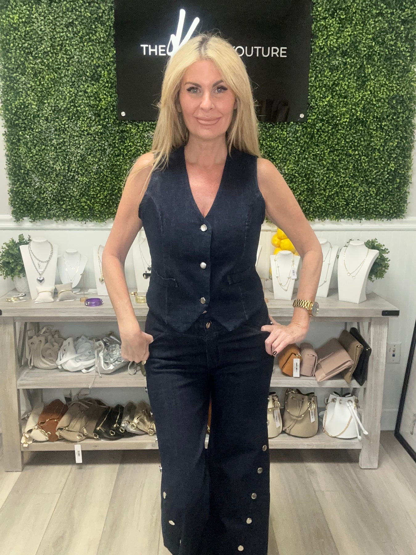 Experience the sheer beauty of our vest set, available in s/m and l/xl. Made from luxurious, stretchy dark denim, featuring elegant button details along the side of the pants. The pants boast a stylish flare at the bottom. Crafted with 99% cotton and 1% spandex for the perfect fit.