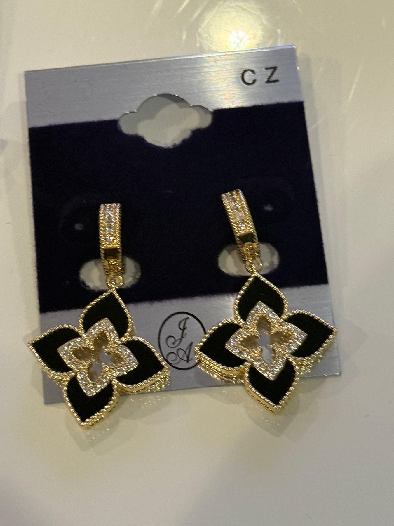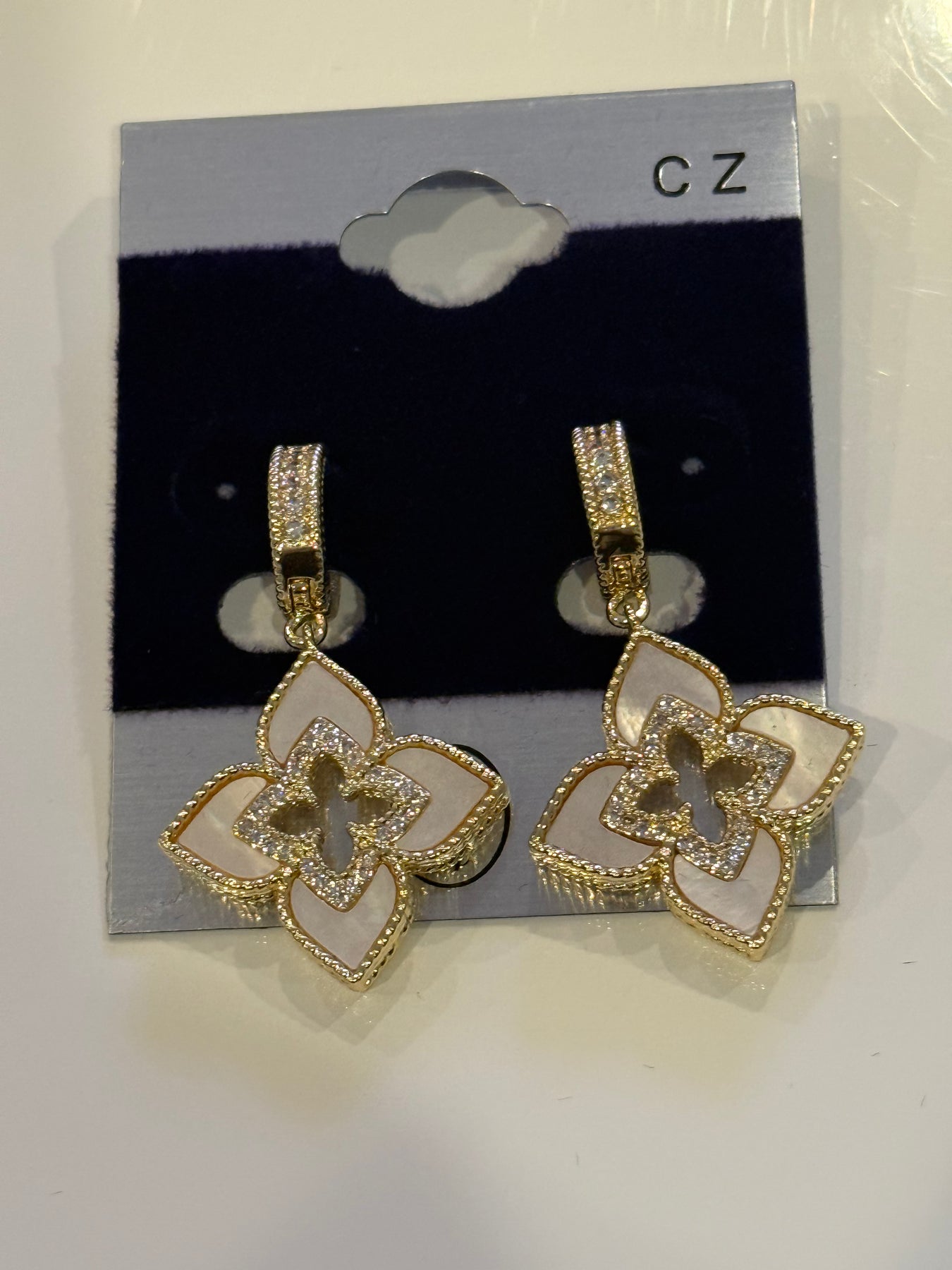 Elevate your look with our Venetian Princess drop earrings adorned with satin, diamonds, and accents of mother of pearl and onyx. Secured with a huggie closure, these elegant and exclusive earrings are the perfect addition to any outfit.